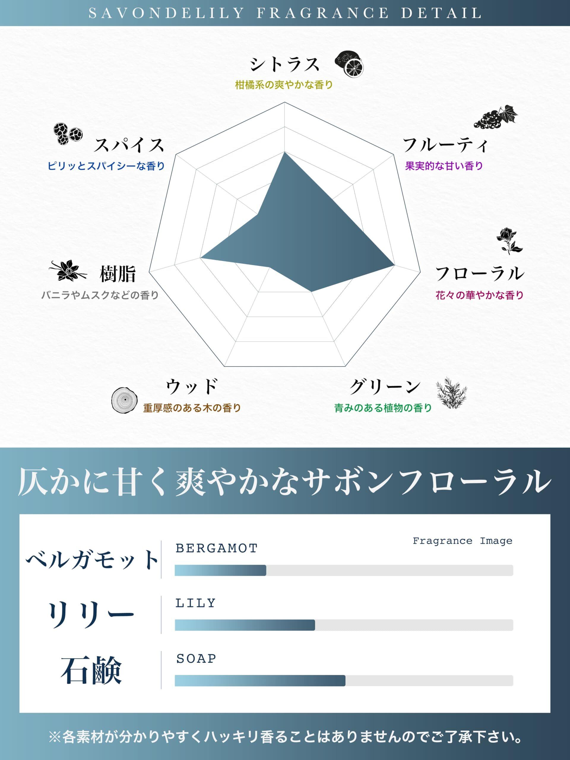 【リリーを主体とし透明感溢れるホワイトフローラル】純潔さの象徴であるユリ(リリー)を主体とした高貴さが漂う純白のサボンノート。ベルガモットの水々しい爽やかさが優しく漂い、リリーとジャスミンの花々が華やかさを添えます。フレッシュで優しい甘さが華やかさを引き立て、洗練された女性らしさと清らかな清潔感が漂うフェミニンな芳香を放ちます。