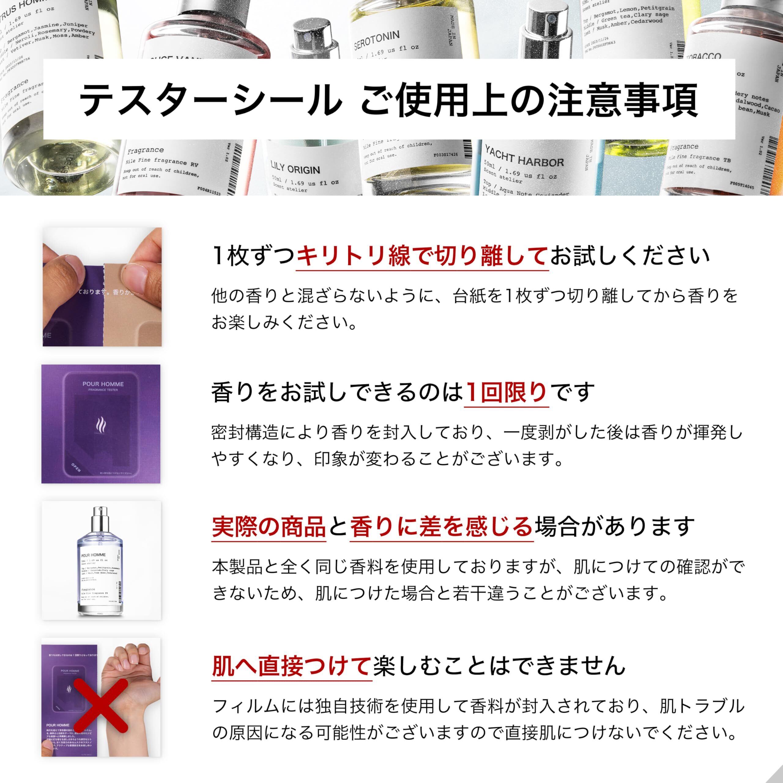 【使用上の注意】本品は香り見本としてご使用ください。香料が直接肌に触れることで、まれに肌トラブルを引き起こす場合がございます。安全のため、肌への直接使用はお控えください。