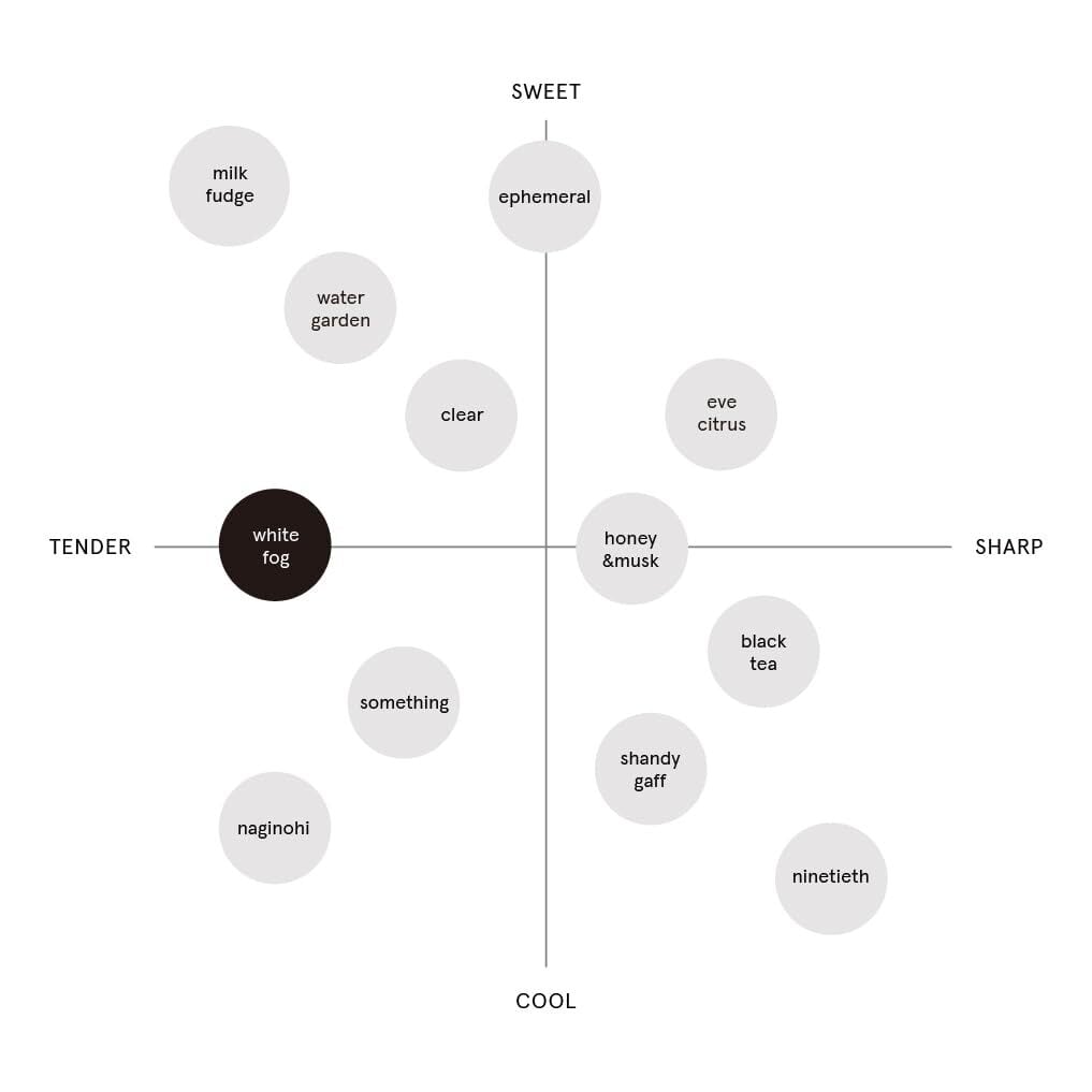 【ホワイトフォグ】「真新しいシーツに包まれる静かな高揚。」それは白の風景。例えるなら、上質なホテルのベッド。深いフローラルの余韻に導かれ、静寂な清潔感に包まれながらまどろみの時へ。