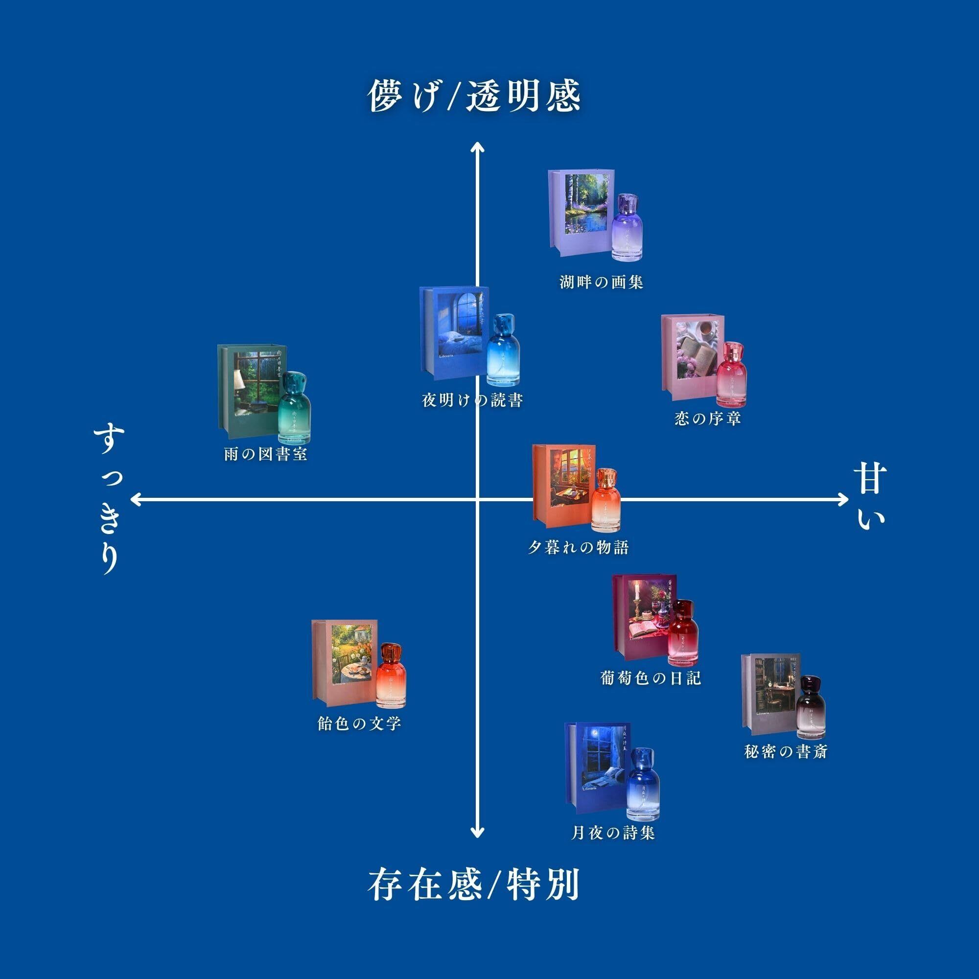 [香り] 春の雨がもたらすアーシーな香り立ちから、古い書籍を思わせるアイリスの甘みが広がり、ラストはシダーウッドとサンダルウッド、そしてムスクが本棚の温もりを感じさせる香りです。