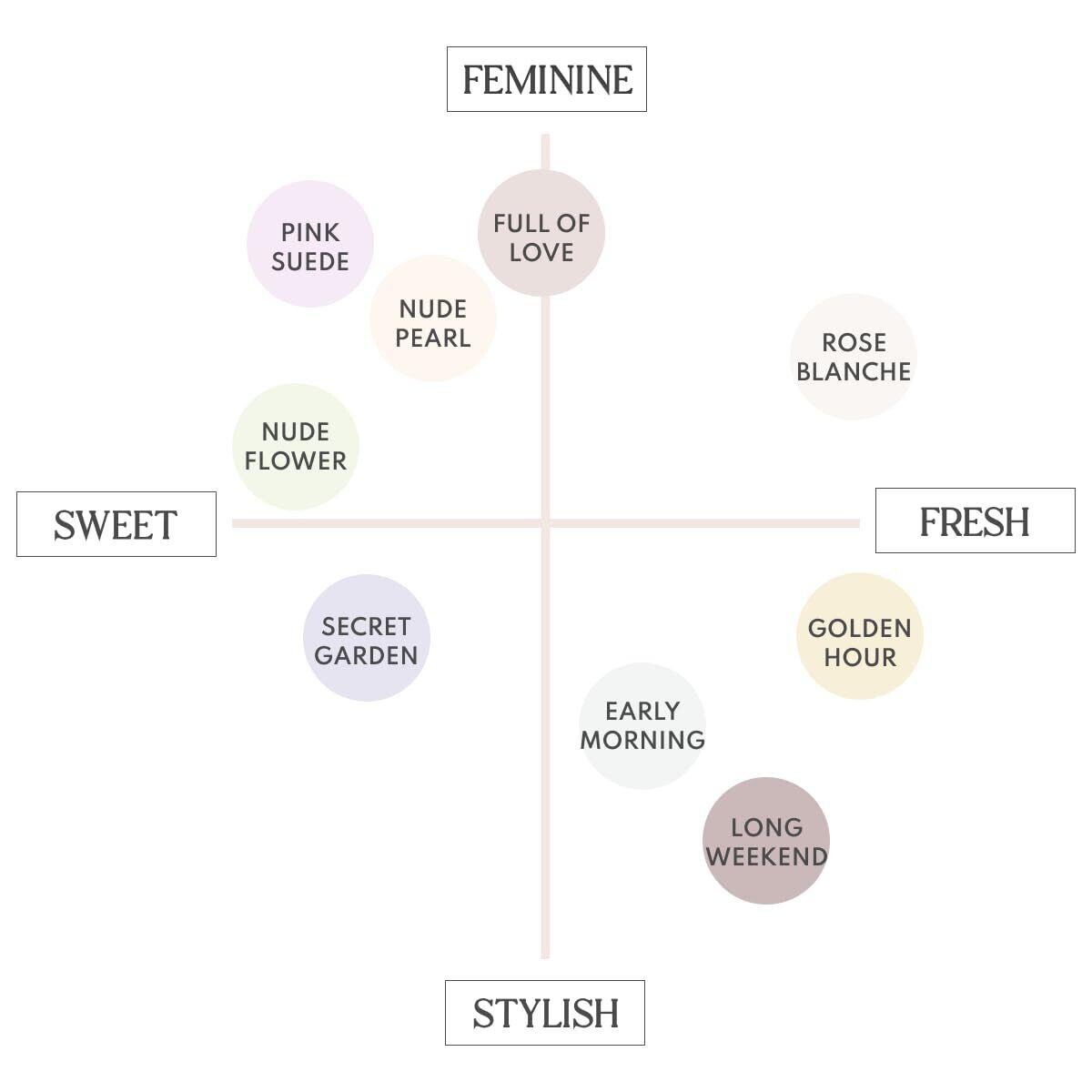 ロマンティックで可憐なティーローズやキャラメルの甘さをベースに、温もりのあるスパイシーさをプラスしたフローラルアンバーの香り。トップにはブラックペッパー、ミドルにはクラリセージの神聖な香りも加わりスペシャルで魅惑的な香調。