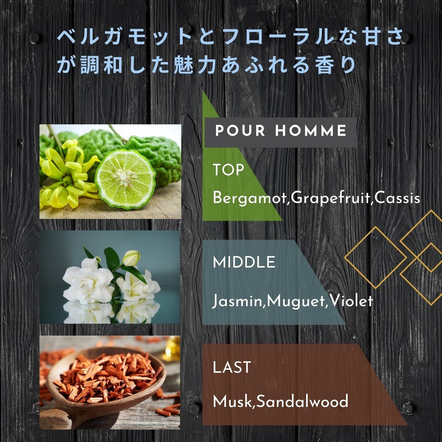 【洗練された大人の雰囲気に】誰にでも好かれる柑橘系の爽やかな第一印象を与え、ムスクとウッディの上品で深みのあるフェロモンの香り。香りの変化で周りの人を惹きつけるメンズ香水