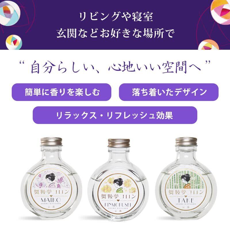 累計販売総数150万個を超える京都コスメ、「舞妓夢コロン」がルームフレグランスとして新たに登場!京都をイメージさせる3種の香りによるリラックス効果でおうち時間をお楽しみください。