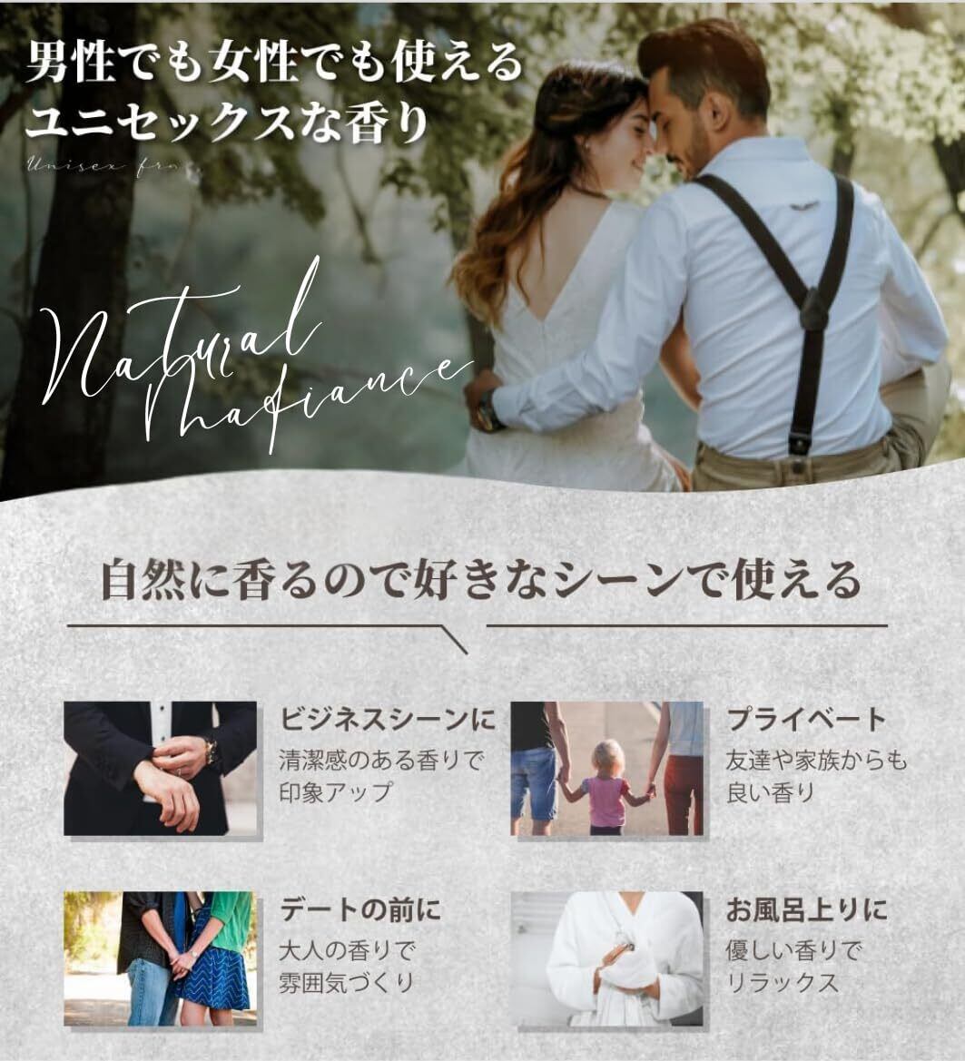 香水ほどキツイ香りではなく自然に香るのでシーンを問わず使えます。