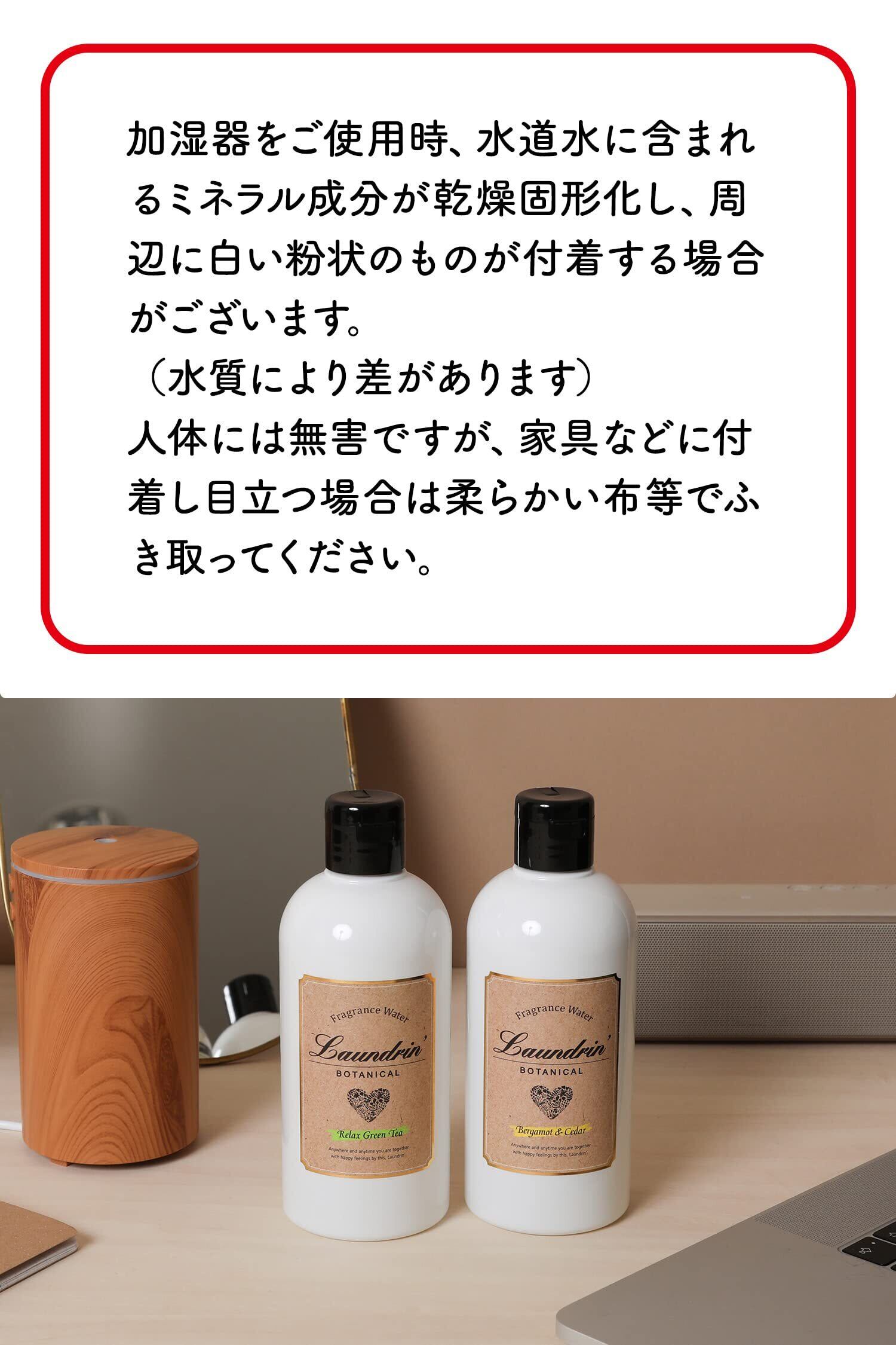 加湿器用のフレグランスウォーター。給水タンクに水道水と一緒に入れるだけ。ふわっと広がる心地よい香りを楽しめます。