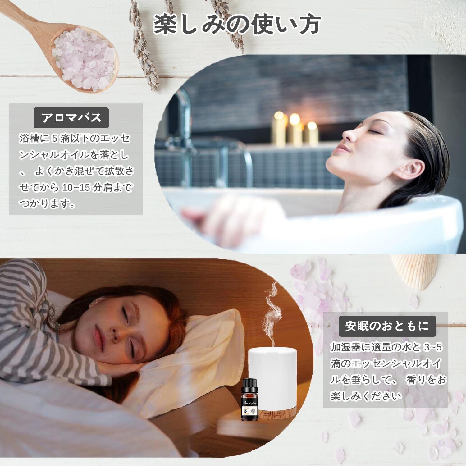 使用方法:卓上、玄関、トイレなどの狭いスペースでは、アロマストーン/アロマランプ/アロマポットなどに垂らして使用できます。一方、リビングルームなどの広い部屋では、アロマディフューザー/加湿器を使って香りを楽しむことができます。