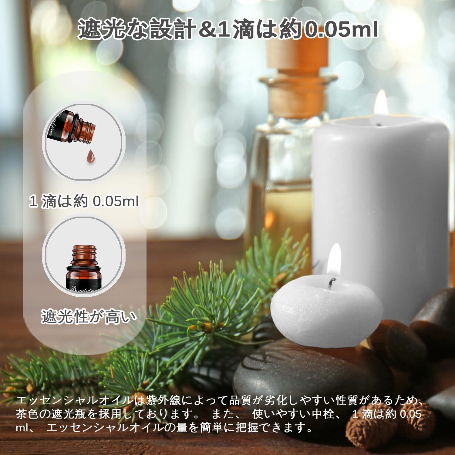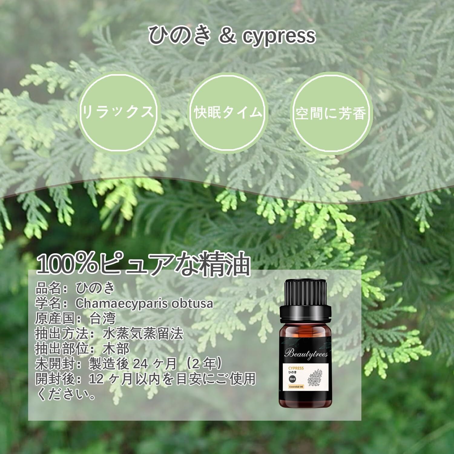 お知らせ:天然純度100%のヒノキ精油です。香りは、空気、空間、使用する容器、使用者の香りへの感受性と好み、また体調の影響を受けて、異なる状況で微細な香りの違いが生じる可能性があります。使用時の空気やご自身の感性に注意しながら、香りの変化を感じながら、実際の状況に応じて使用量を増減させ、楽しいひとときをお過ごしください。