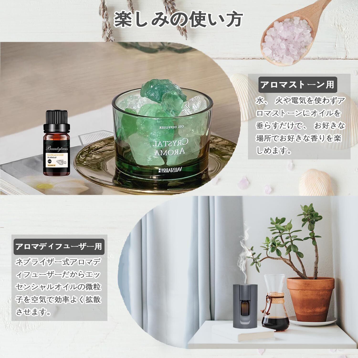 使用方法: 卓上、玄関、トイレなどの狭いスペースでは、アロマストーン/アロマランプ/アロマポットなどに垂らして使用できます。一方、リビングルームなどの広い部屋では、アロマディフューザー/加湿器を使って香りを楽しむことができます。