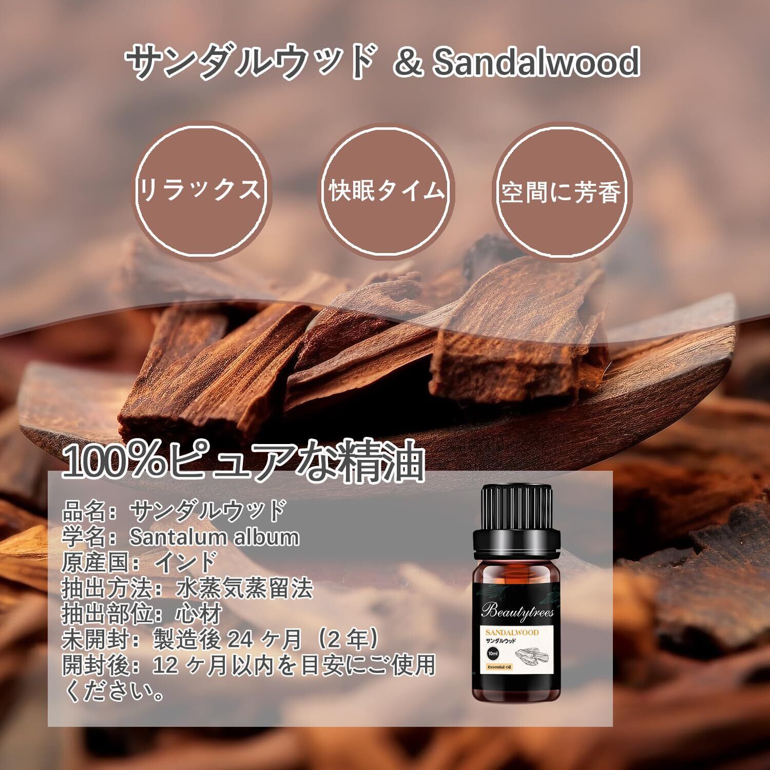 Beautytrees サンダルウッド 白檀 精油 エッセンシャルオイル 天然100% アロマオイル 10ml アロマ 加湿器・ディフューザー・アロマストーン・お風呂