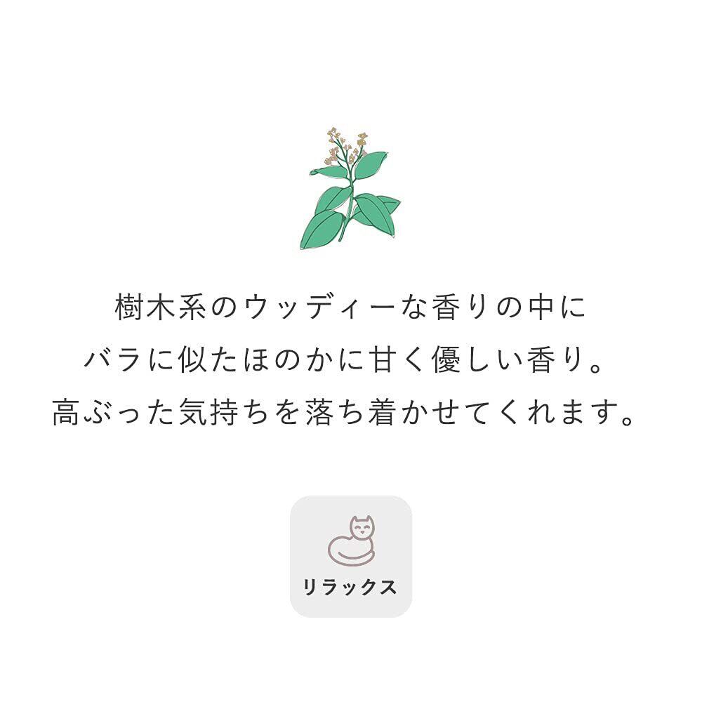 【説明】樹木系のウッディーな香りの中にバラに似たほのかに甘く優しい香り。高ぶった気持ちを落ち着かせてくれます。