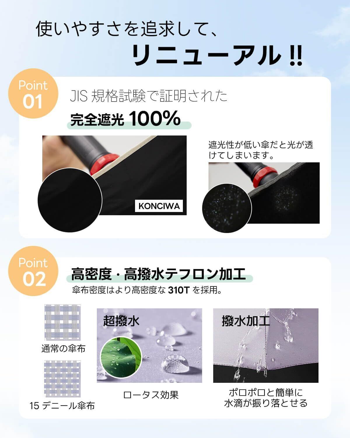 【2022最新】konciwa 日傘 軽量 189g-199g UVカット率 100% 完全遮光 遮熱 反射冷却素材採用 ワンタッチ自動開閉 折りたたみ傘 コンパクト 折り畳み日傘 紫外線遮断 耐風撥水 晴雨兼用 携帯便利 メンズ レディース 母の日 父の日 | 無意味ステッカー
