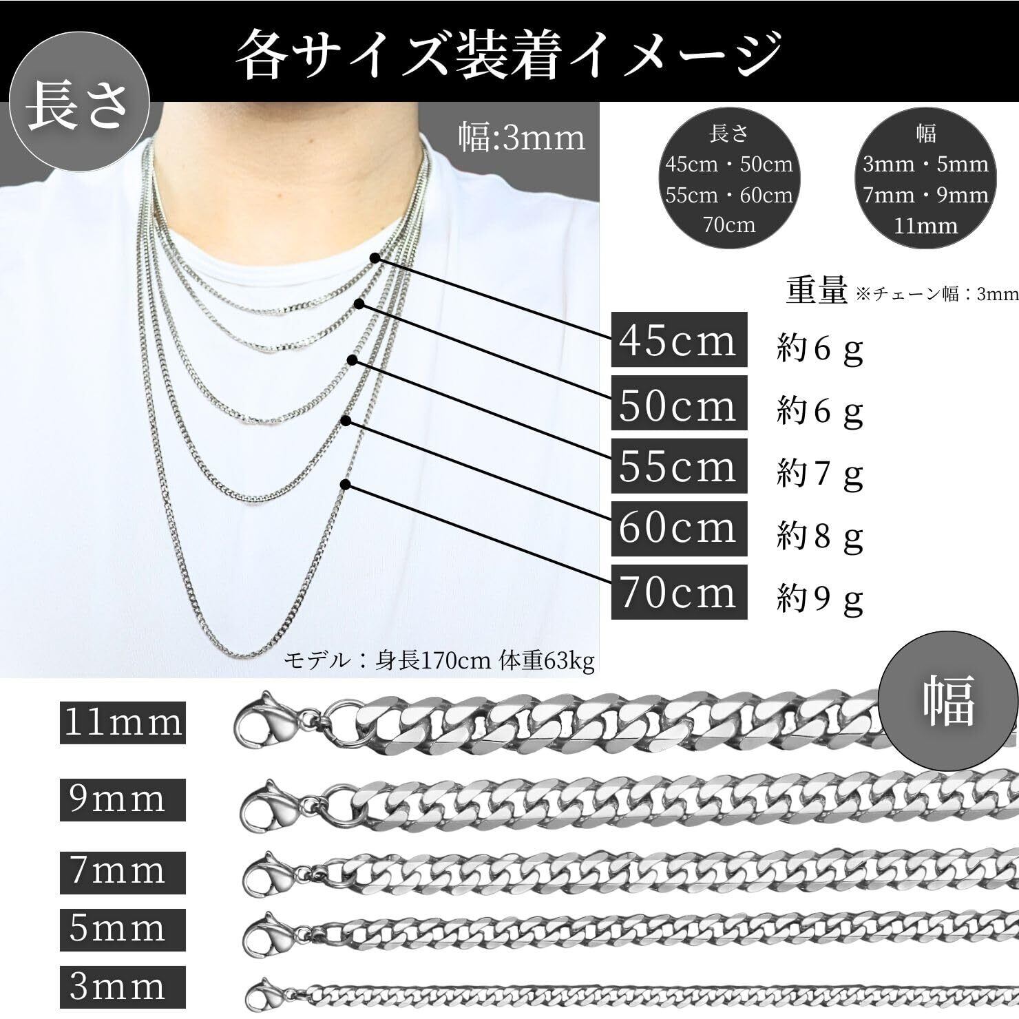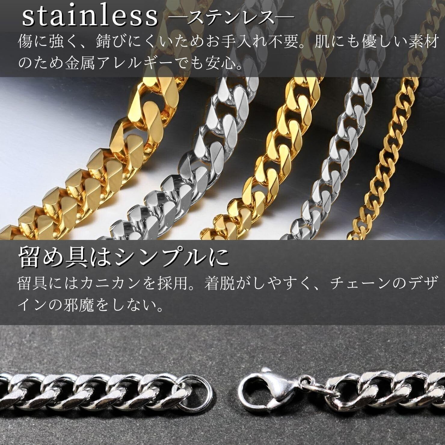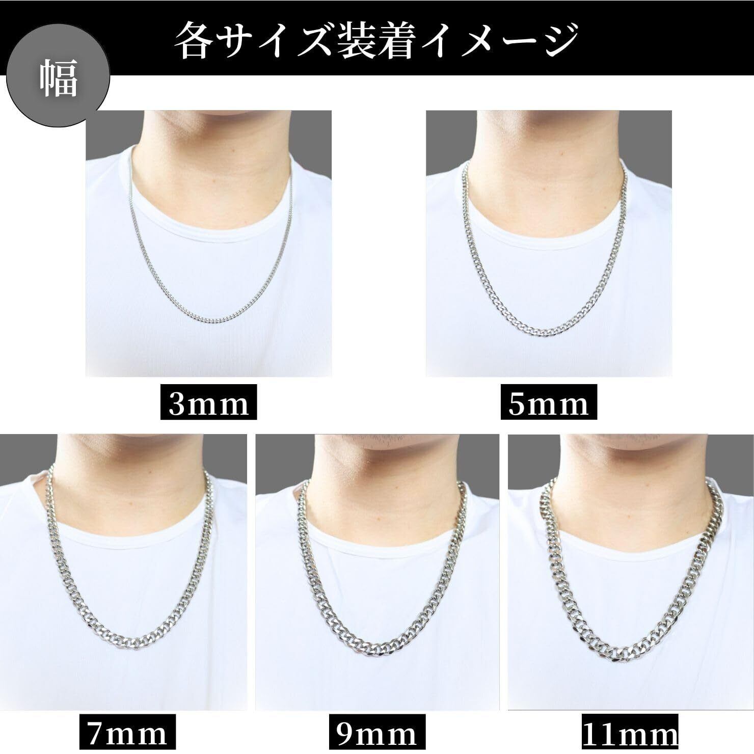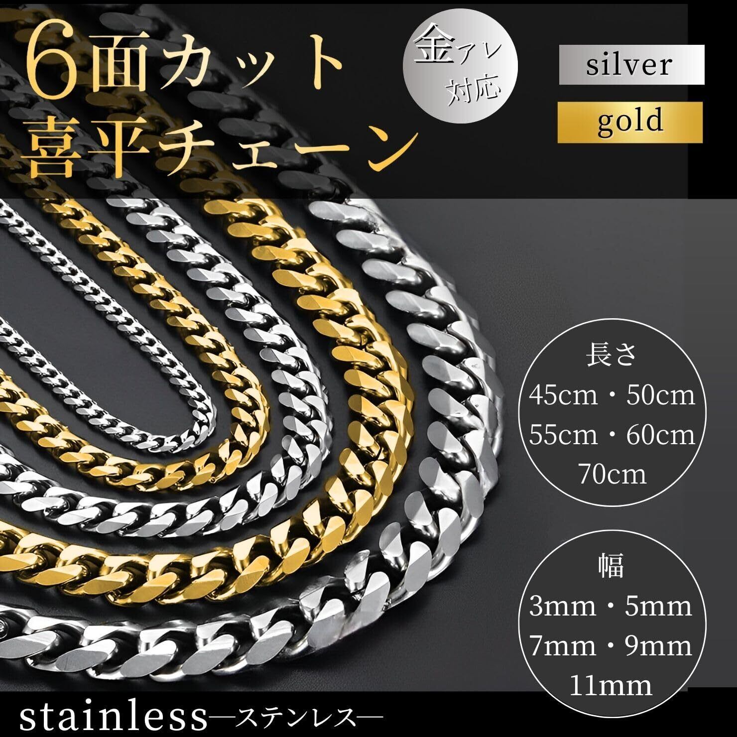 【豊富なバリエーション】カラーはシルバーとゴールド、チェーンの幅は3mm/5mm/7mm/9mm/11mm、長さは45cm/50cm/55cm/60cm/70cmの全50種類をご用意しております。スタイリッシュな印象の細めのデザインから存在感が抜群の太めのデザインまでお好みのデザインをお選びいただけます。※「商品の説明」より全サイズの画像がございますのでご参照くださいませ。また複数サイズを重ね付けしたり、お気に入りのペンダントトップを付けたり、様々な楽しみ方があるのでシンプルなのに飽きが来ない、そんなネックレスになります。