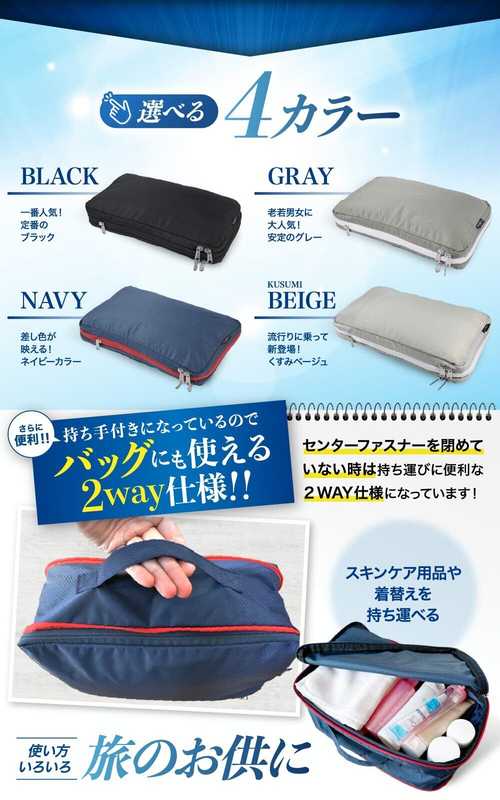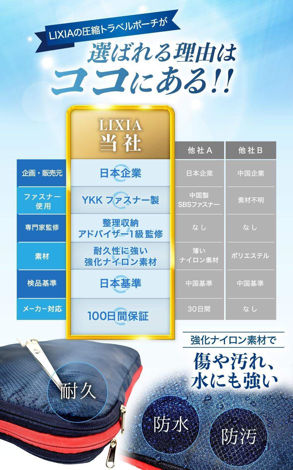 特徴 圧縮機能、ダブルファスナー、ナイロン素材
