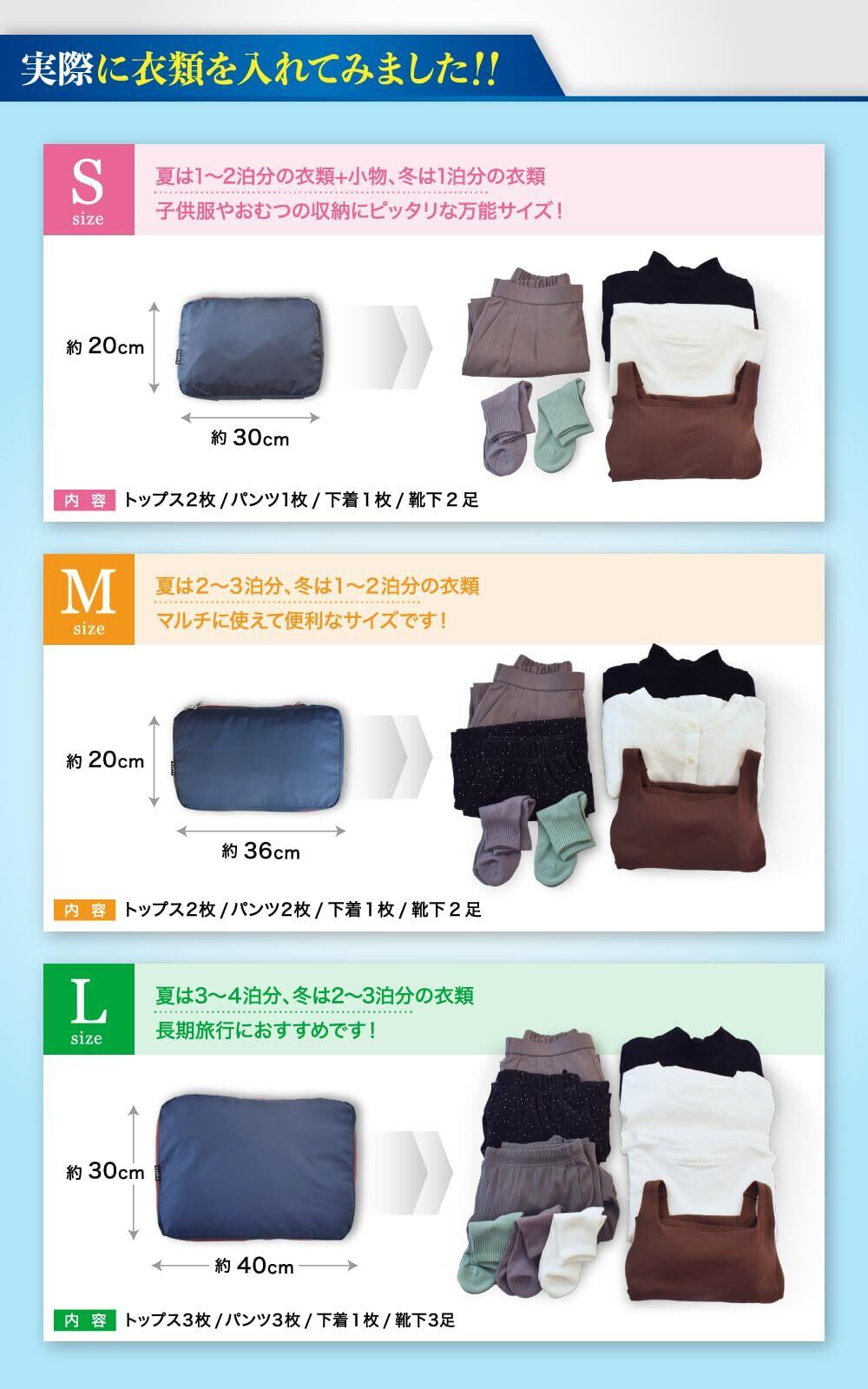 【こんなシーンで活躍】 旅行に。 荷物を最小限に抑えたい出張などに。 着替えを用意しておきたいキャンプに。 クローゼットで使用頻度の低い衣類の収納にも。ちょっとしたお出かけにも必須の一品。