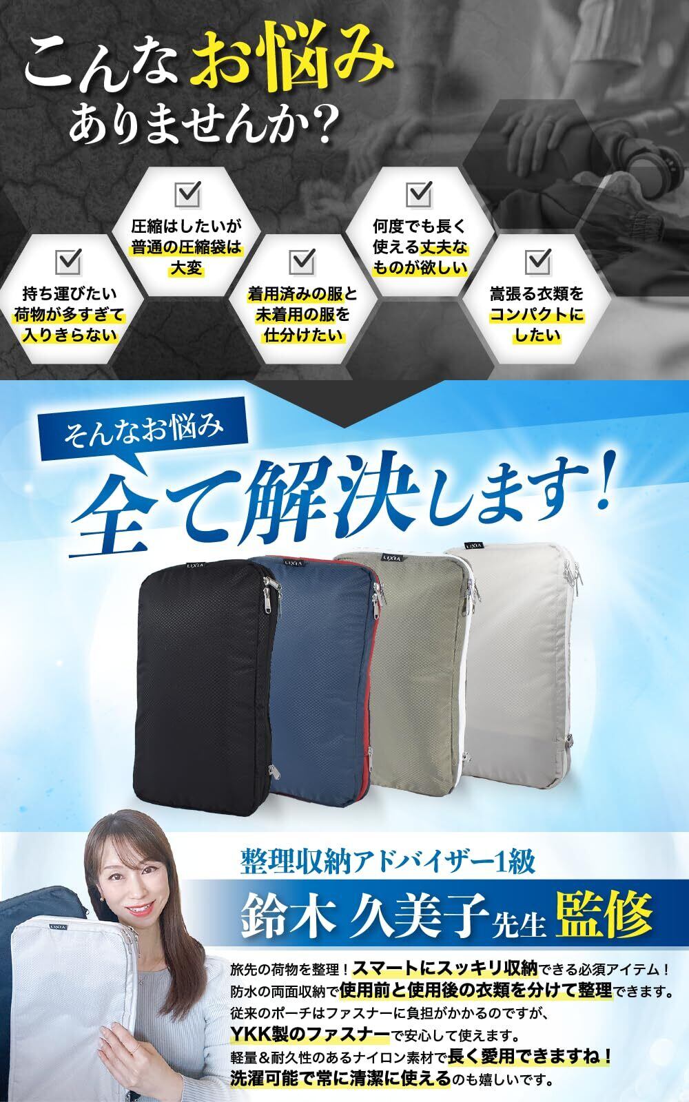 【ファスナーを閉めるだけで簡単圧縮】 かさばる衣類があっという間にスッキリ!衣類を畳んで納め、チャックを閉めるだけで約50%圧縮できるバッグです。是非LIXIAの圧縮バッグで荷物に囚われない旅行をお楽しみください!