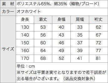 110:着丈47cm身幅34cm肩幅29cm裄丈52cm、120:着丈50cm身幅37cm肩幅31cm裄丈57cm、130:着丈53cm身幅40cm肩幅33cm裄丈62cm、140:着丈56cm身幅43cm肩幅35cm裄丈67cm、150:着丈60cm身幅46cm肩幅37cm裄丈72cm、160:着丈64cm身幅49cm肩幅39cm裄丈77cm、170:着丈68cm身幅52cm肩幅41cm裄丈81cm