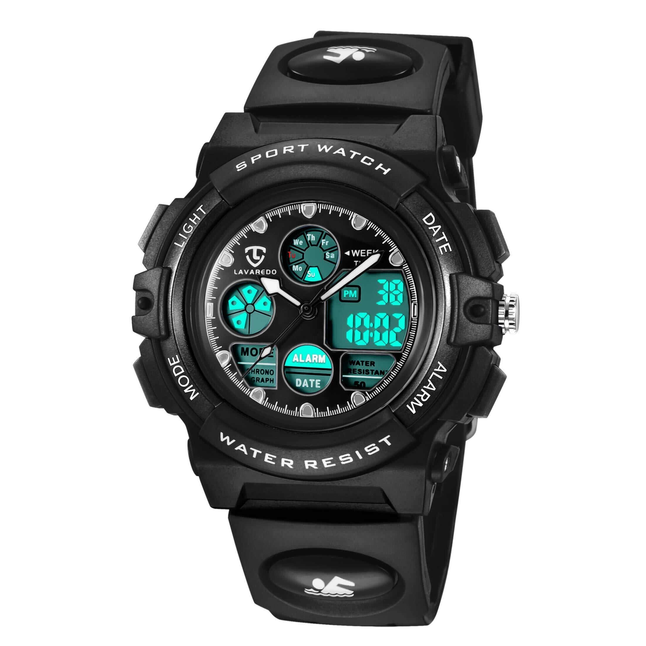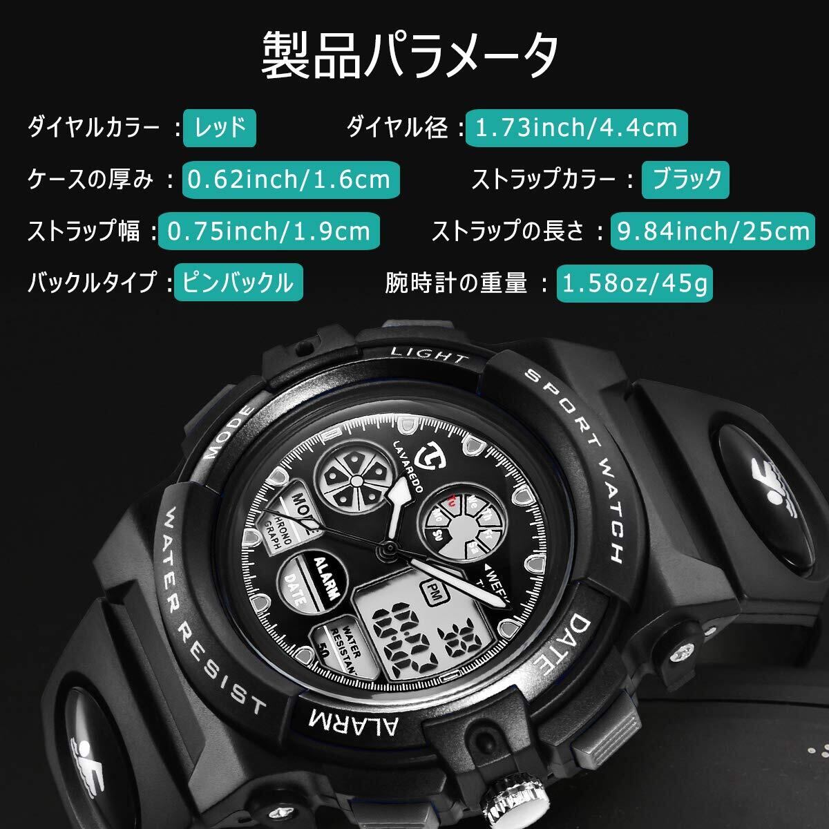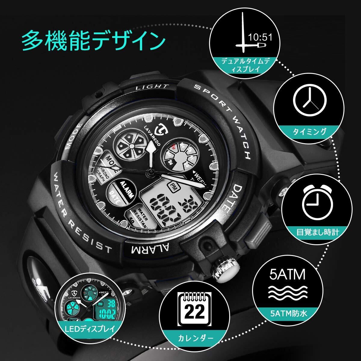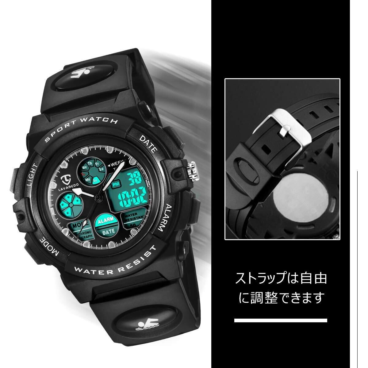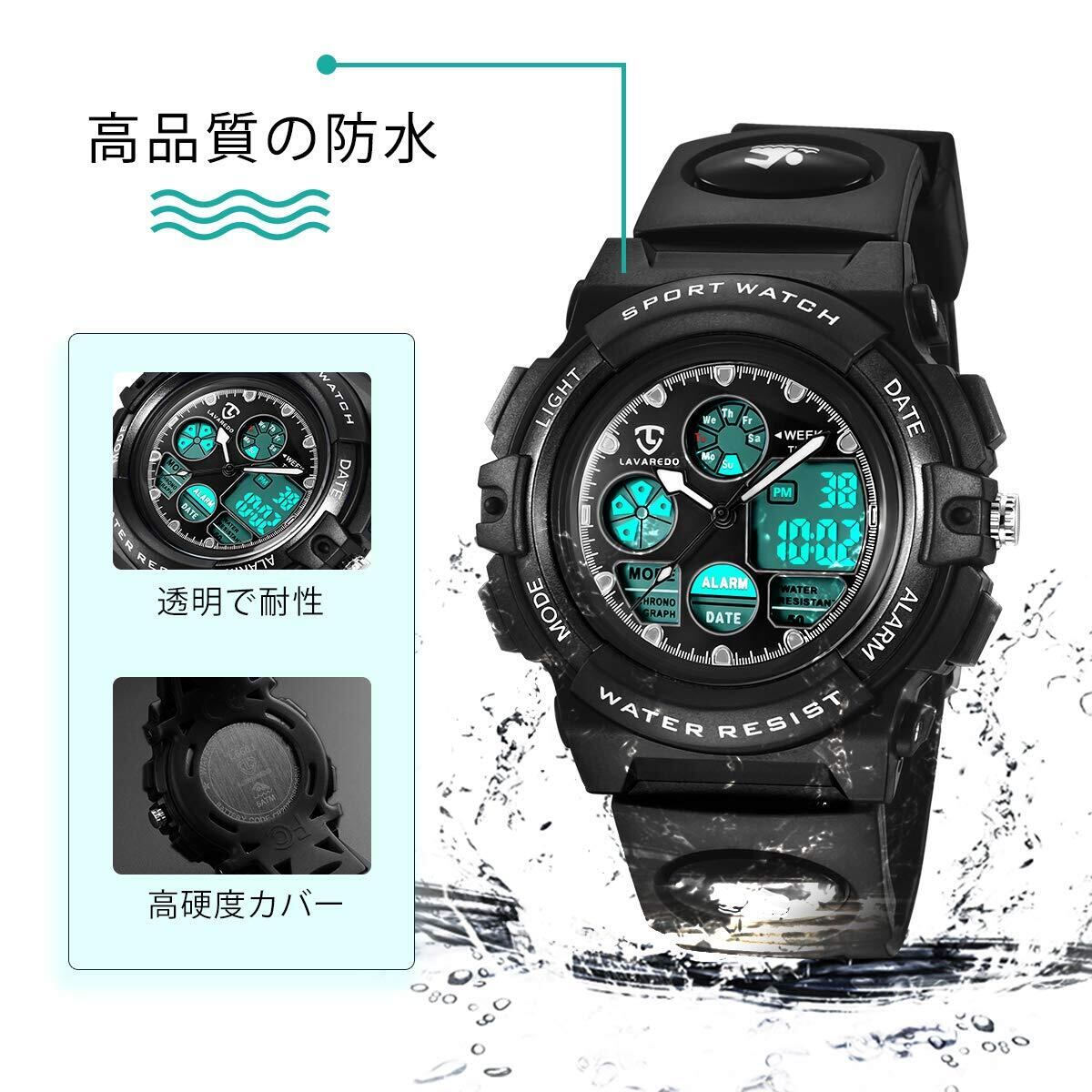 子供腕時計 ボーイズスポーツウォッチ アウトドア多機能50m防水 アラート 日付曜日表示 デュアルタイム LED アナログ表示 男の子 デジタルウォッチ (ブラック)