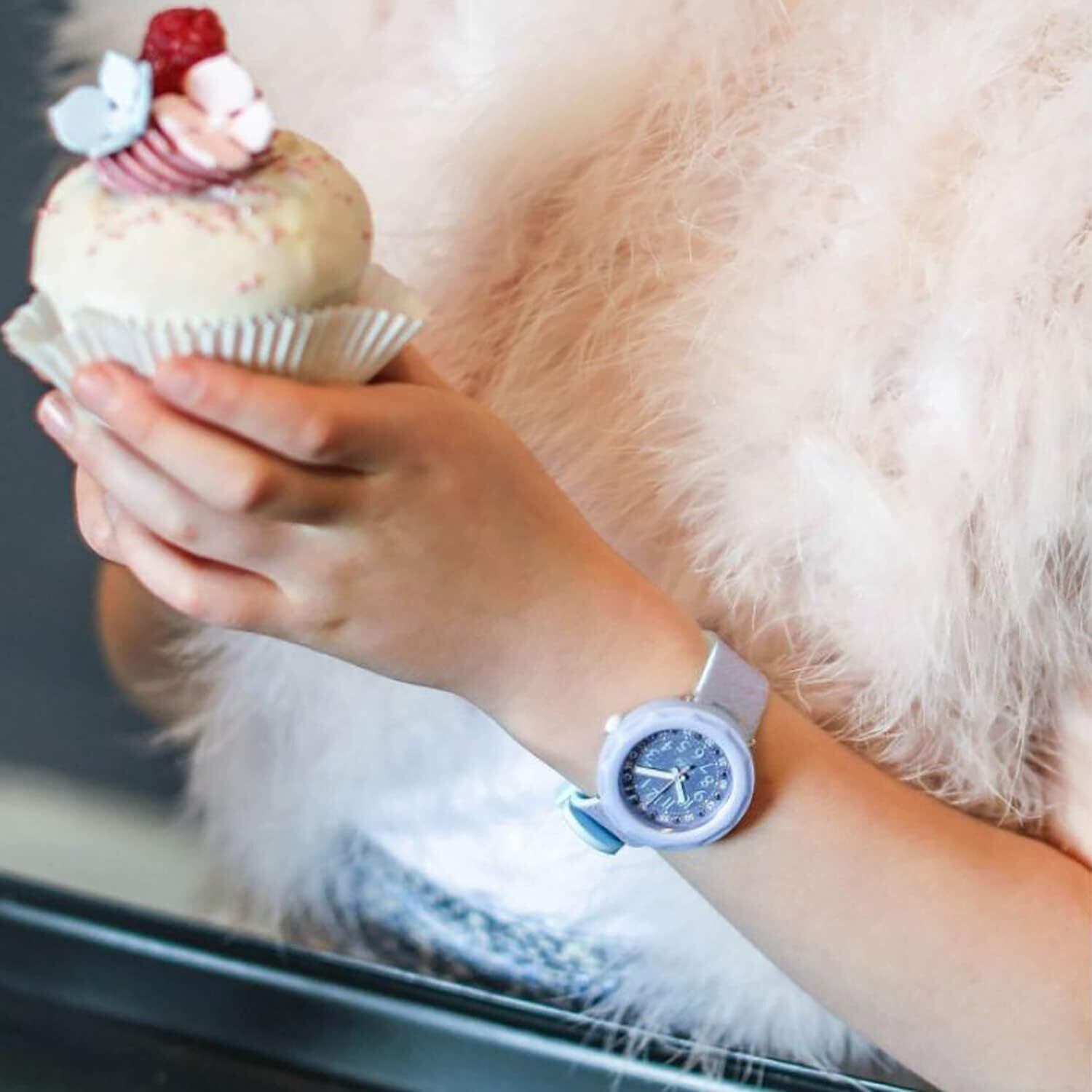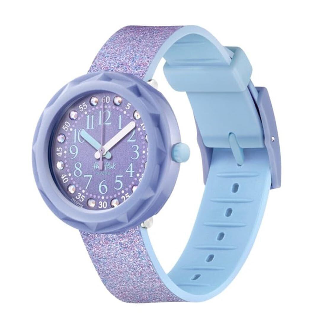 鮮やかなパープルのストラップ、メタリックなデジタルプリントの文字盤、そしてジェムストーンが目を惹くLILAXUS。このBPAフリーのスイス製キッズ用ウォッチは、回転ベゼルつきで、いつも楽しく時計の読み方を覚えられます。