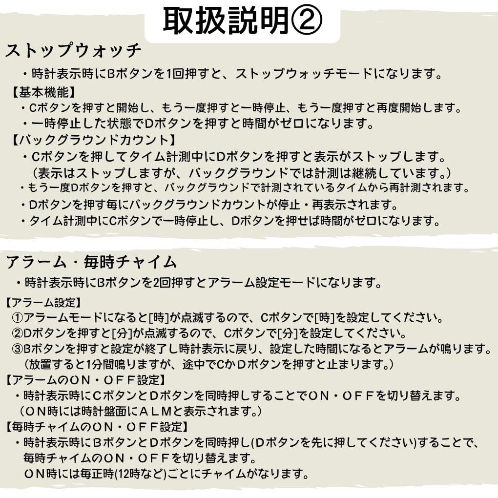 3.使いやすさを追求: デジタル表示のため子供でも一目瞭然。 大きく明瞭な数字で時間がすぐにわかります。 またボタンの配置や機能もシンプルでお子様でも簡単に操作できます。