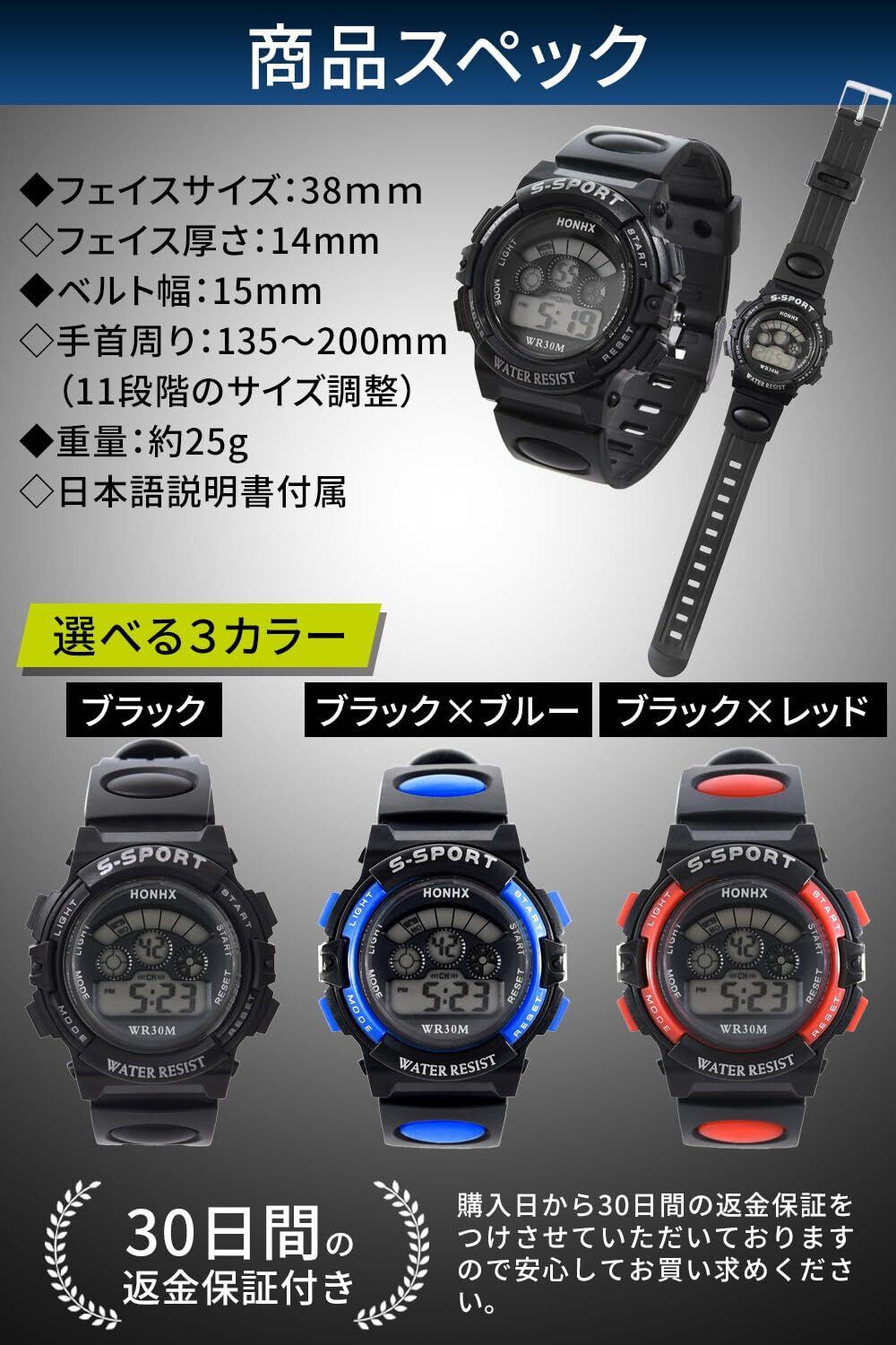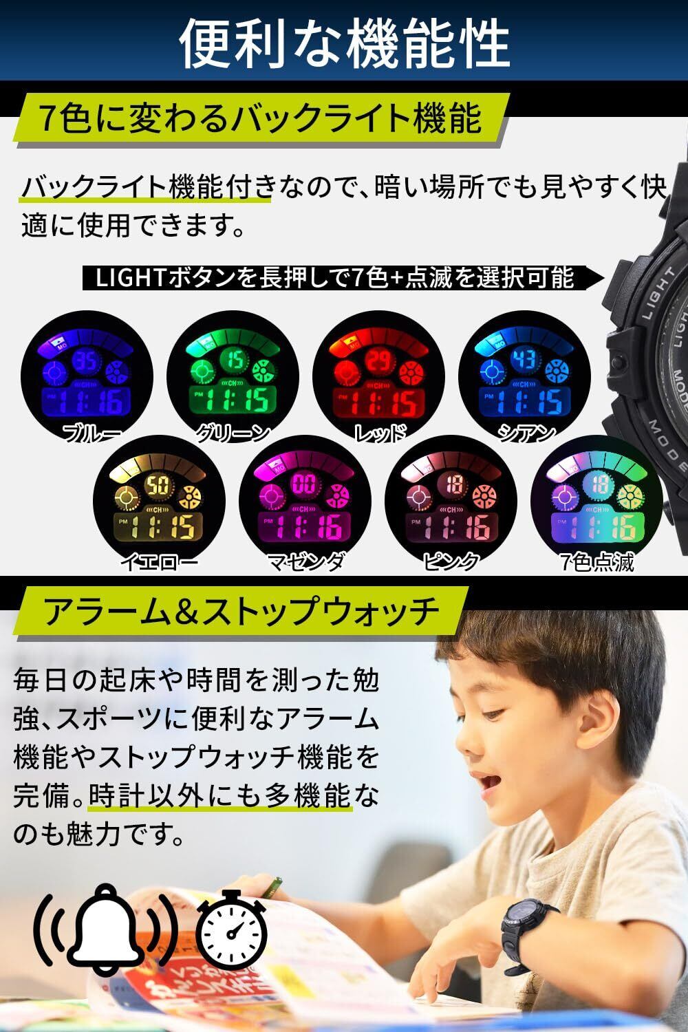 【 多機能スポーツウォッチ 】 日付や時間表示はもちろん、曜日、アラーム、ストップウォッチ、バックライト機能を搭載した多機能スポーツウォッチです。日本語説明書付きでシンプルな設定後すぐにお使いいただけます!シンプルで飽きの来ないデザインと10段階のサイズ調整機能で、お子様の成長に合わせて長くお使いいただけます。