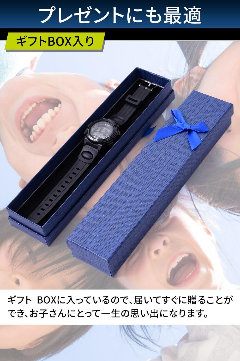 【 腕時計デビューはカッコよく 】 大人顔負けのスポーツウォッチデザインで、シンプルながらしっかりとした存在感を持つ一品です。初めての腕時計をつける瞬間を、特別な体験に。ギフトBOXに入っているので、届いてすぐに贈ることができ、お子さんにとって一生の思い出になります。
