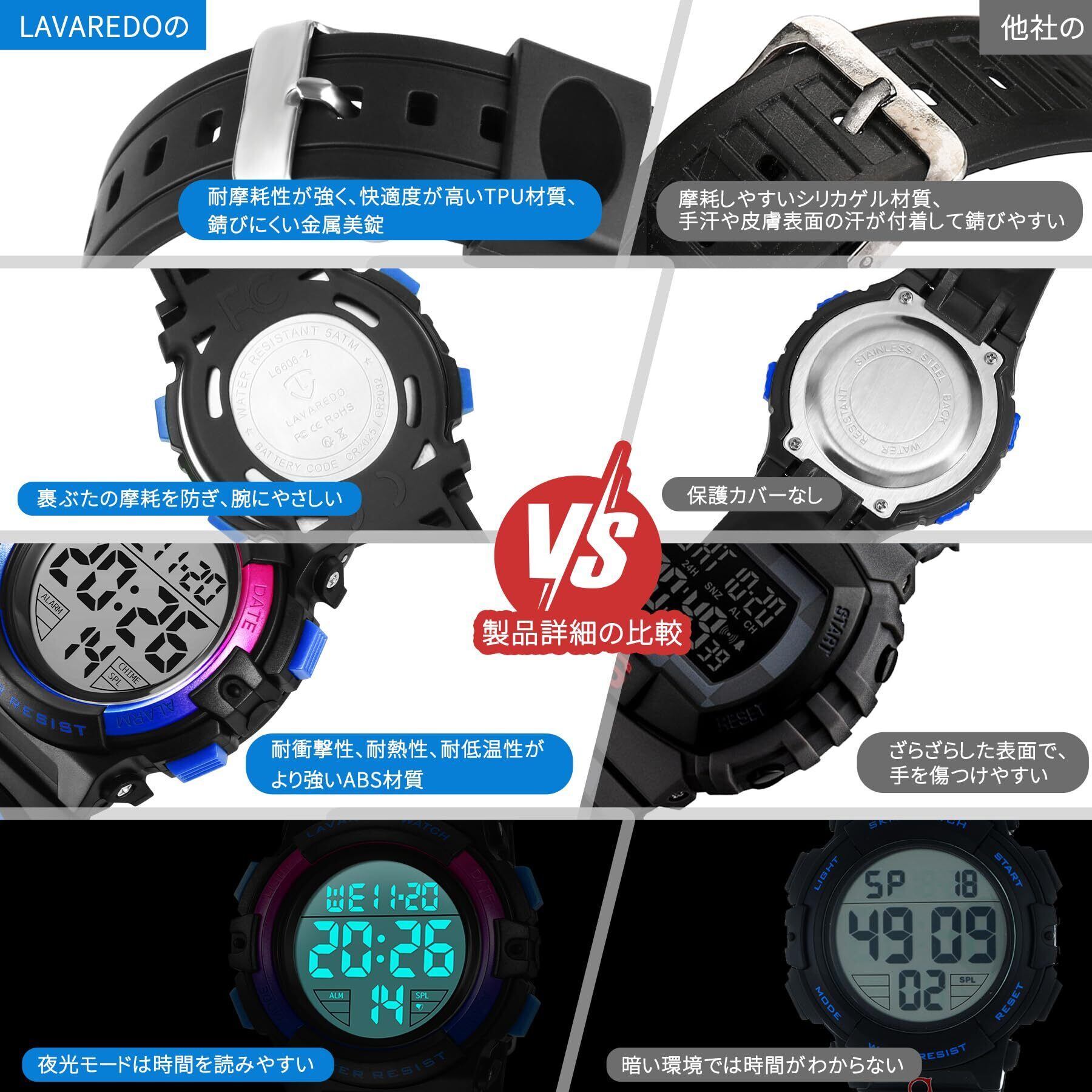 【超快適な素材を採用して】:スポーツウォッチは高品質のTPU素材を採用し、耐摩耗性が強く、壊れにくく、快適度が高い。錆びにくいステンレス製の美錠と裏ぶたを採用し、耐久性がより強い。はっきりとした表示画面と大きな数字表示で、より子供向けのデジタル腕時計です。