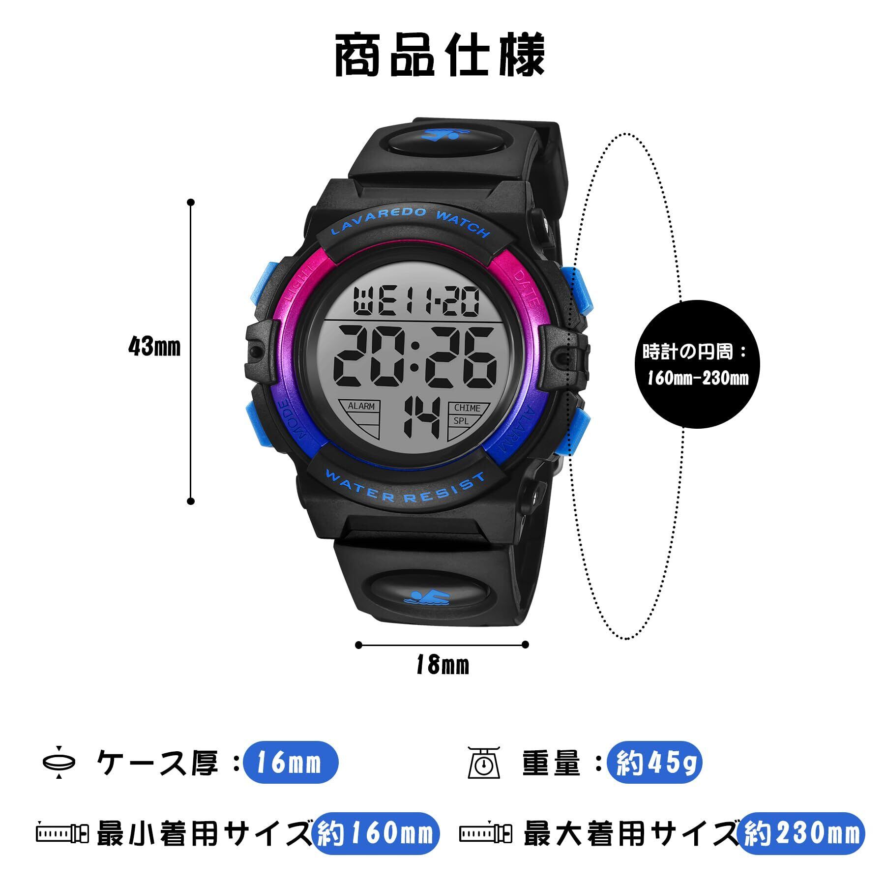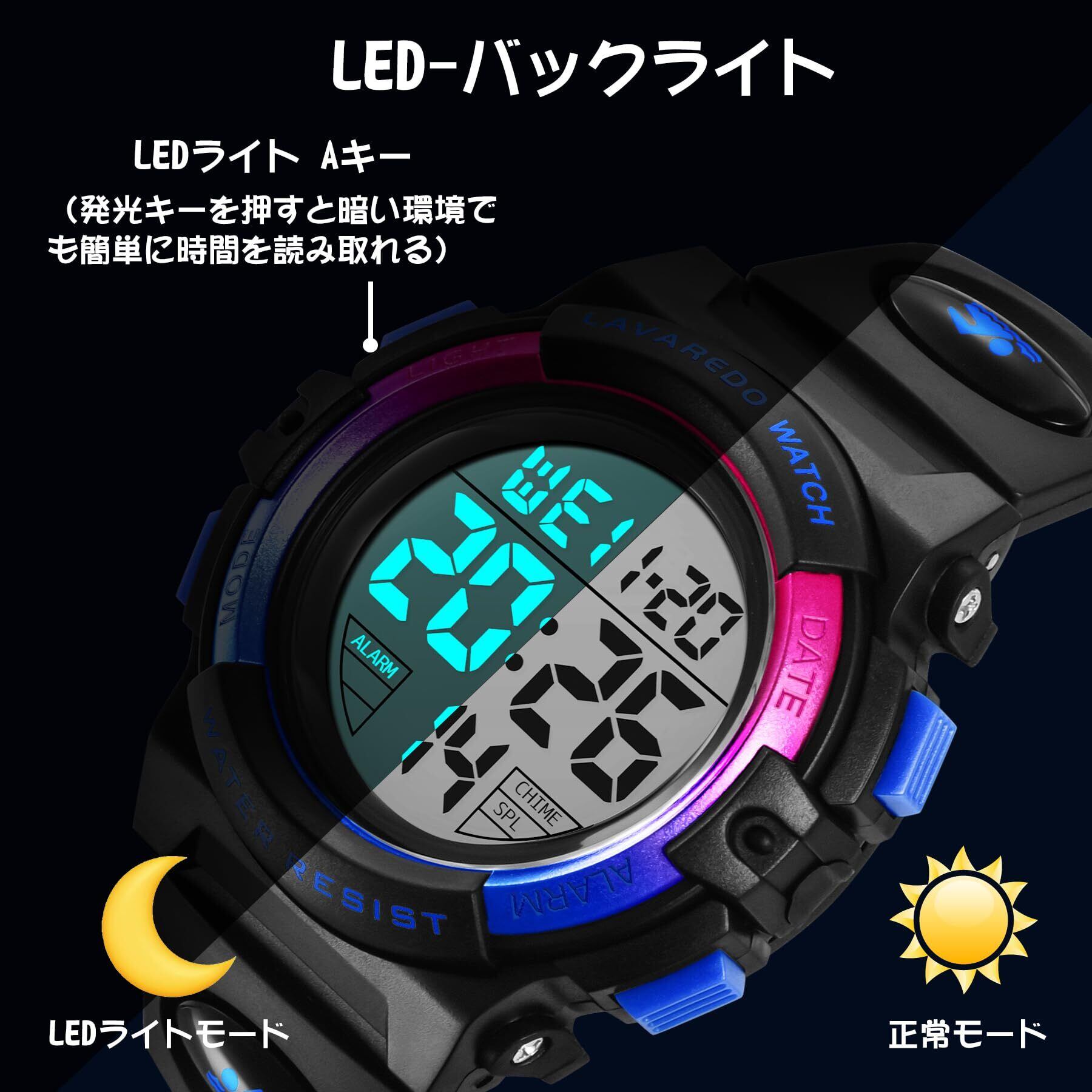 【多機能付き 子供腕時計】:デジタル表示、LED発光表示、日付曜日表示、アラーム、ストップウォッチなどさまざまな機能を搭載したキッズ用 腕時計です。LED機能を使えば暗い環境でも簡単に時間を読み取ることができます。
