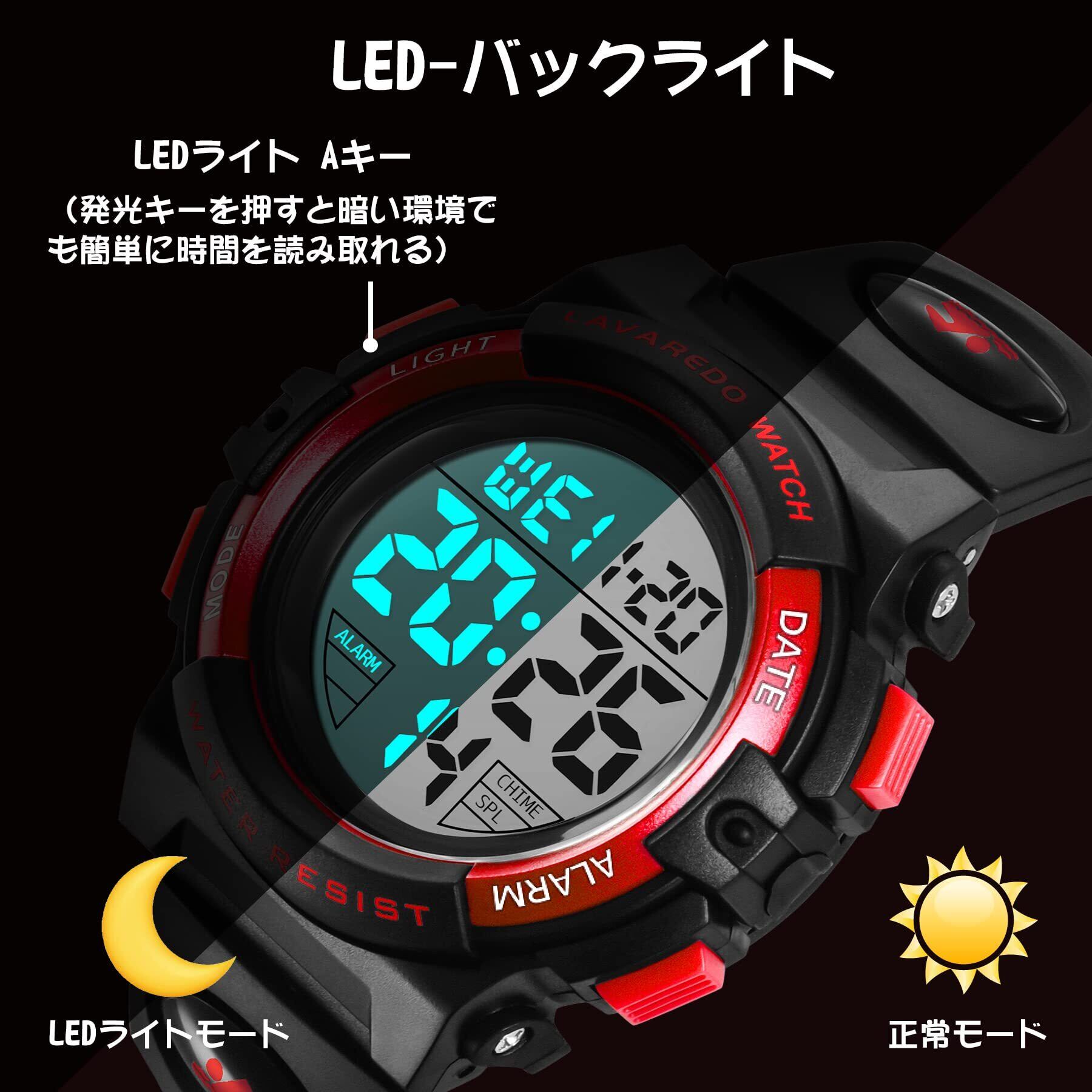 【多機能付き 子供腕時計】:デジタル表示、LED発光表示、日付曜日表示、アラーム、ストップウォッチなどさまざまな機能を搭載したキッズ用 腕時計です。LED機能を使えば暗い環境でも簡単に時間を読み取ることができます。