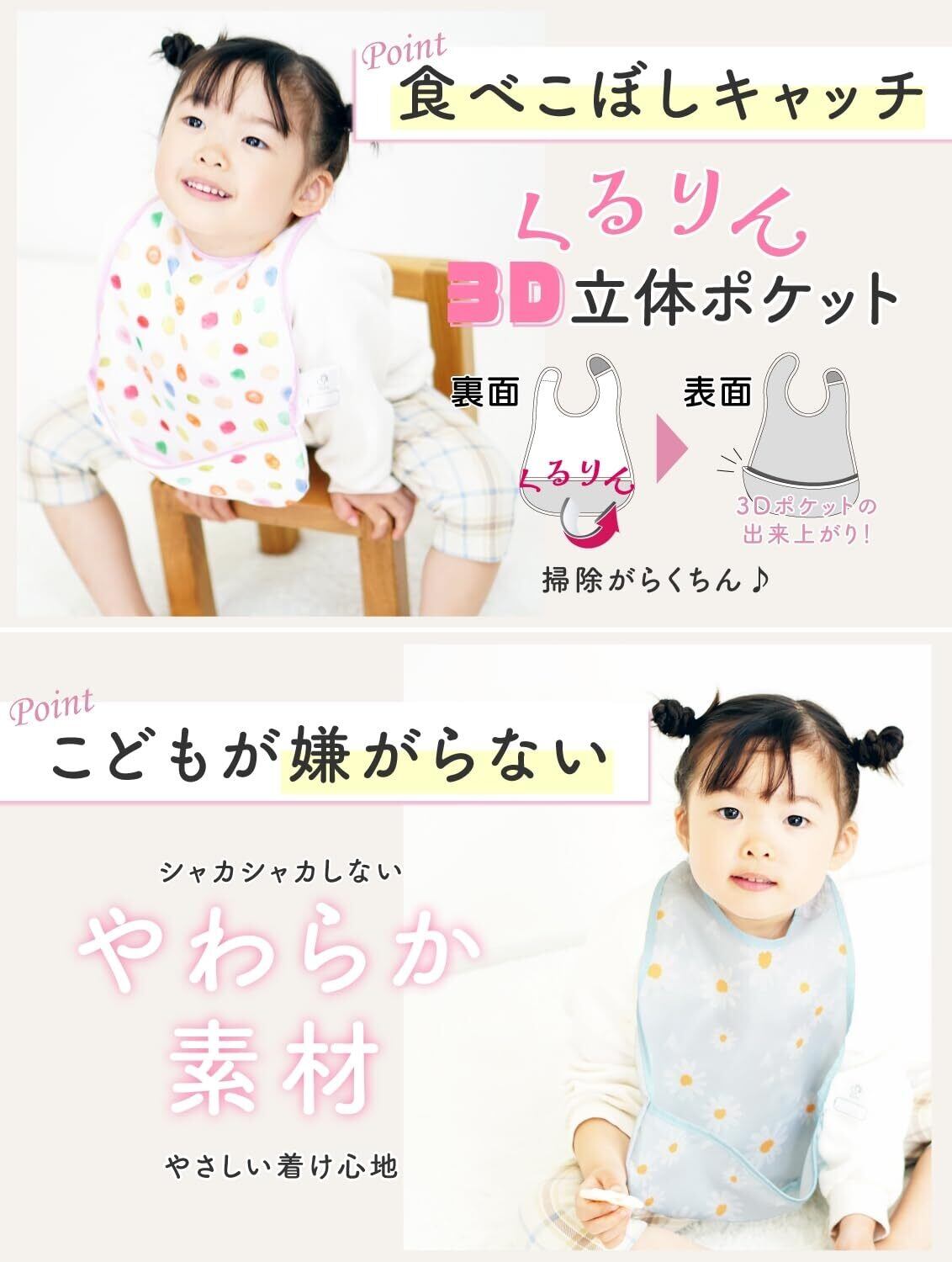 3Dくるりんポケット で食べこぼしをキャッチ Riris の お食事エプロン は独自の 立体構造 ポケットで食べこぼしをしっかりキャッチ 床掃除の手間ラク