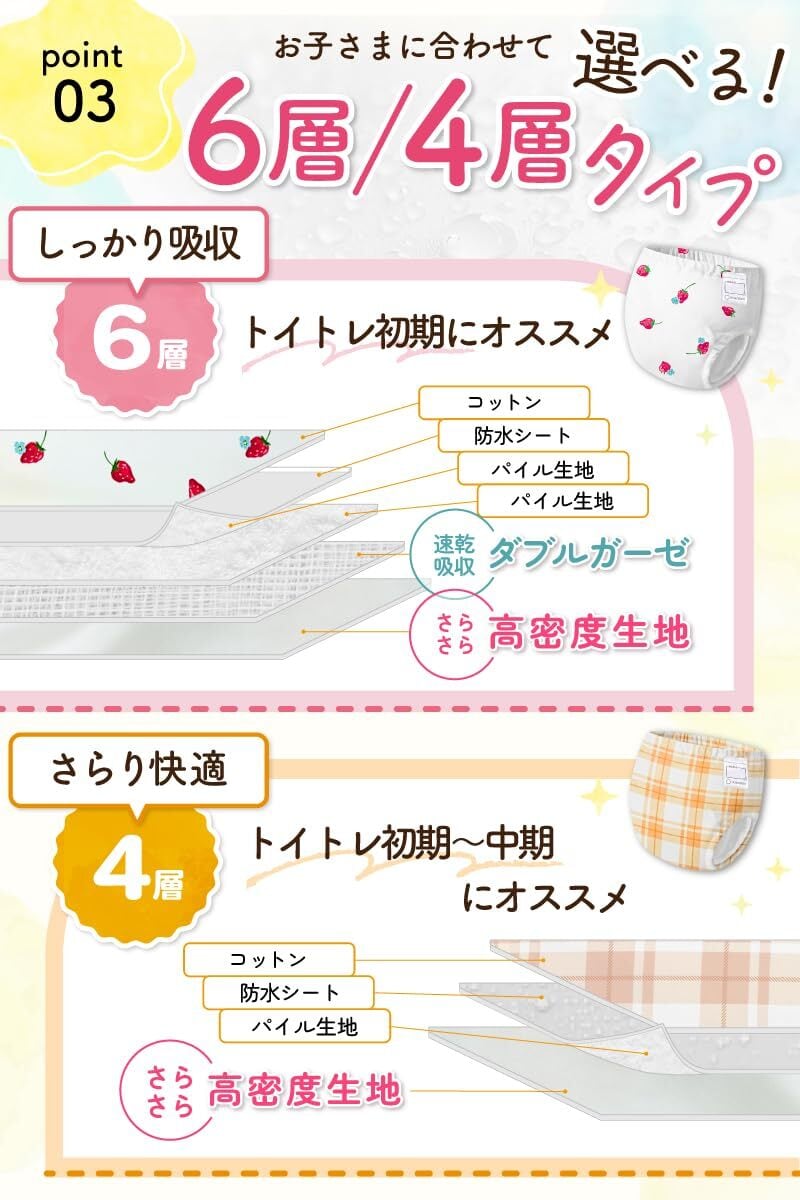 【トレパンとオムツの違いはなに?】 トレパンは「おしっこの感覚」をつかむためのアイテムです。オムツとの違いは、あえてモレる作りになっています。漏れた感覚を体験することで、「次はトイレに行こう」という気持ちが自然と育ちます◎【トレパンの選び方は?】「サラリーノ」は、心に余裕をもってお子さまのトイトレを進めたい!と願うママパパを応援するために生まれました。6層タイプはトイトレ初期で吸収力を重視したい方に。4層タイプはトイトレ初期・中期で通気性を重視したい方にオススメです。どちらも、トイトレ初期からお子さまとママパパをしっかりサポート◎お子様の成長や、トイトレの目標に合わせてお選びいただけます。
