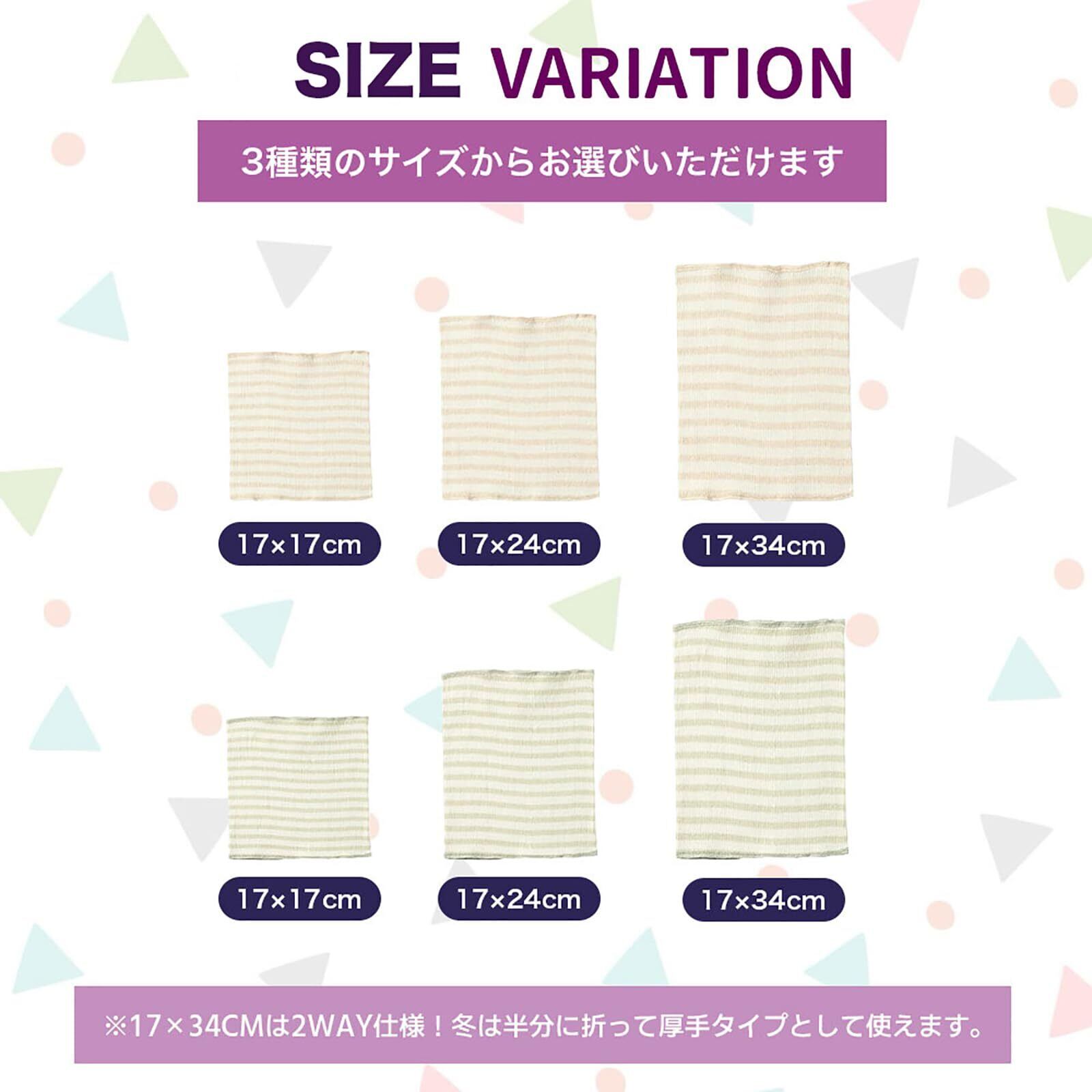 選べる3サイズ(17x17cm、17x24cm、17x34cm)で、(17x34cm~年中使えるベビー腹巻、夏は一枚で冬は二重にして使用するのも便利です、縦長タイプで二つ折にしても使えちゃう。)