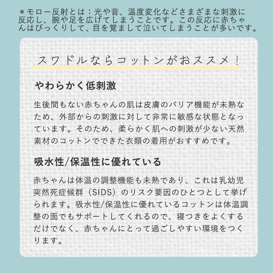 【注意事項】※柄の出方や配置には個体差があります。※月のプリントは左右が反転している場合があります。 ※対象年齢はあくまで目安となります。※仕様上柄のプリントが歪んでいる場合があります。また手書き風のデザインのため、プリントの一部が消えている場合があります。※スワドルの背中の左下のタグは、外側に縫い付けているので直接肌に触れません。タグを引っ張ると生地が裂けてしまうため、ひねるようにちぎると簡単に切り離せます。