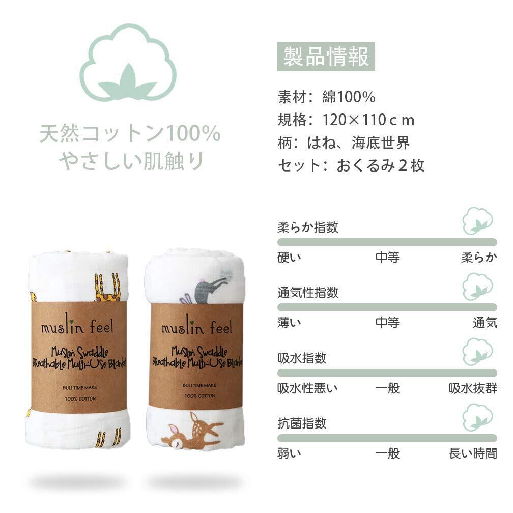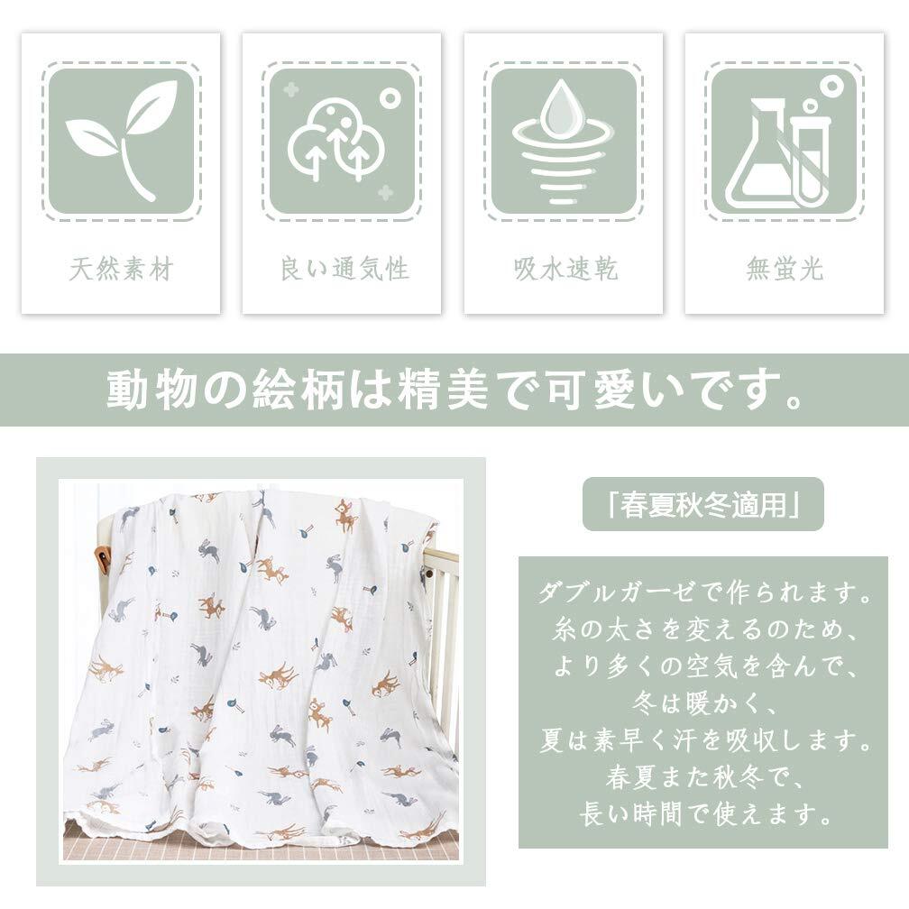 2.「コットン100%」天然コットン100%で製造され、非常に柔らかい肌触りがあります。ダブルガーゼで空気が通じるし、吸水性も優れています。赤ちゃんの敏感なお肌を守ります。ちょうどよい厚みで、暑いときはは涼しく寒い時は暖かくなって、一年を通じて使用できます。
