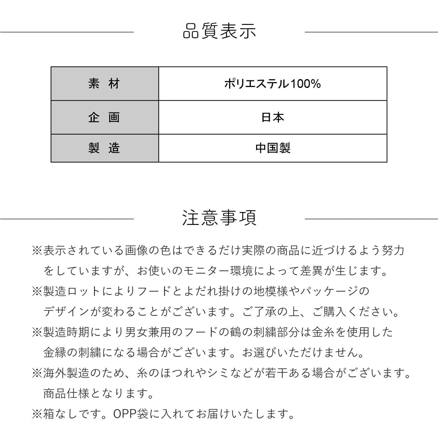 ※製造時期により男女兼用のフードの鶴の刺繍部分は金糸を使用した金縁の刺繍になる場合がございます。お選びいただけません。