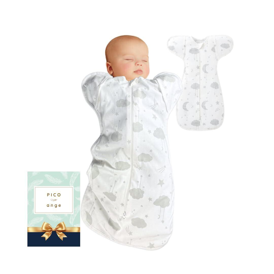【在庫セール】[PICO ange] 【皮膚科クリニック院長 推奨】天然コットン100% 天使のおくるみ 新生児からの快適スワドル [ダブルジッパーでおむつ替え楽々] オールシーズン用 (ホワイト(YOZORA柄), Sサイズ(3~6kg,新生児~3ヵ月頃)) | 無意味ステッカー