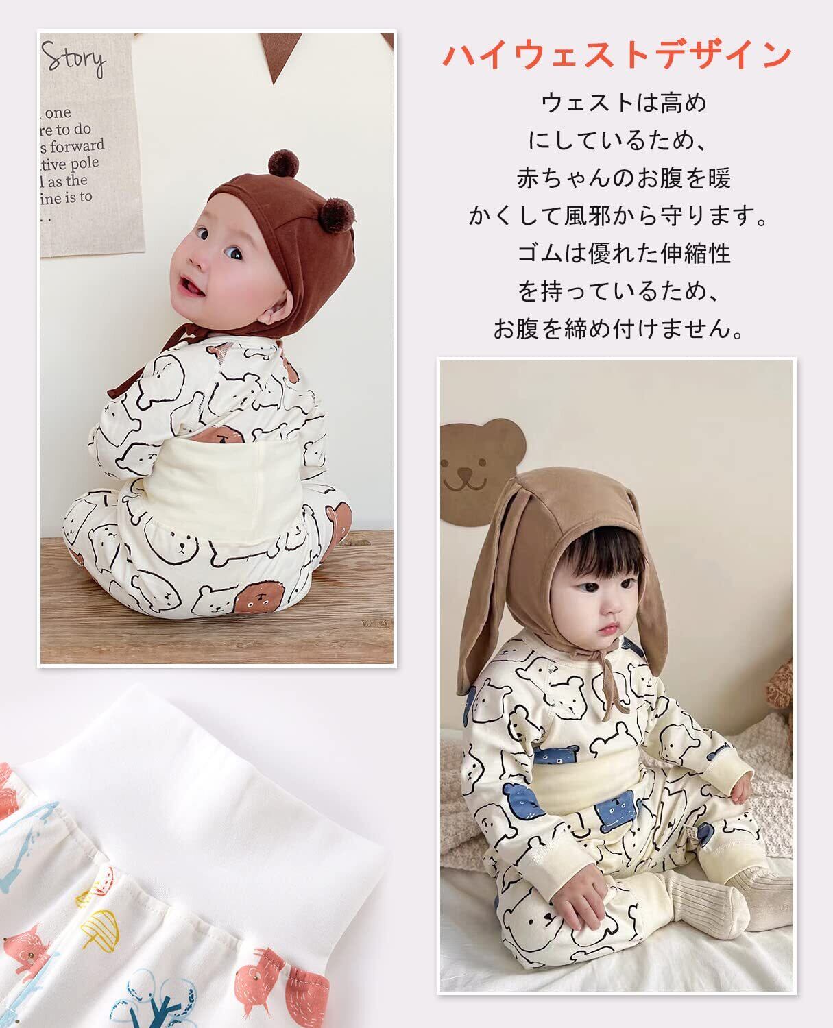 ハイウェストデザインをしていて、風邪がひかないように赤ちゃんのお腹を暖かく守ります。ゴムは優れた伸縮性を持っているため、お腹を締め付けません。