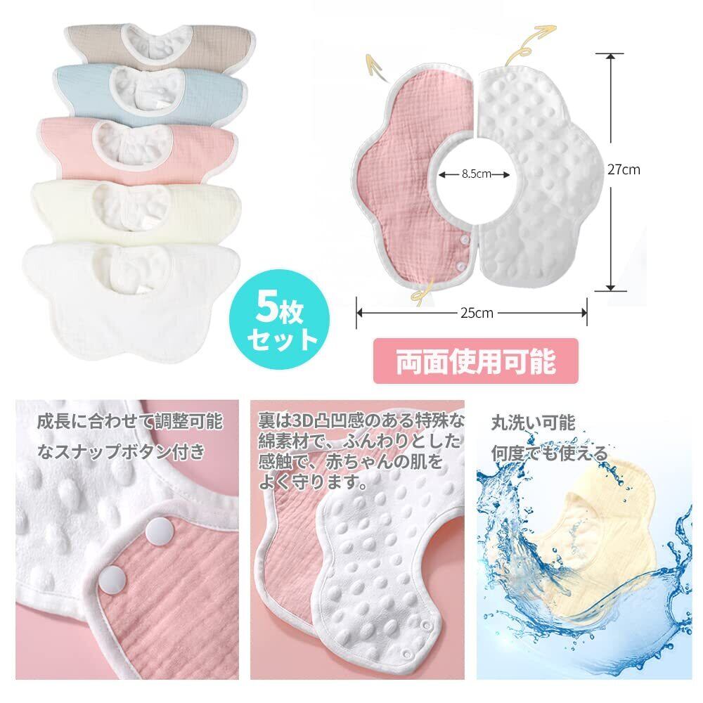 [MIPOHAM] よだれかけ スタイ 防水 ガーゼ 360 赤ちゃん 女の子 男の子 ベビー ビブ 3D 無地 エプロン 食事 用 綿 プレゼント 通気 吸水 柔らかい セット おしゃれ プレゼント (1 無地 5枚セット)