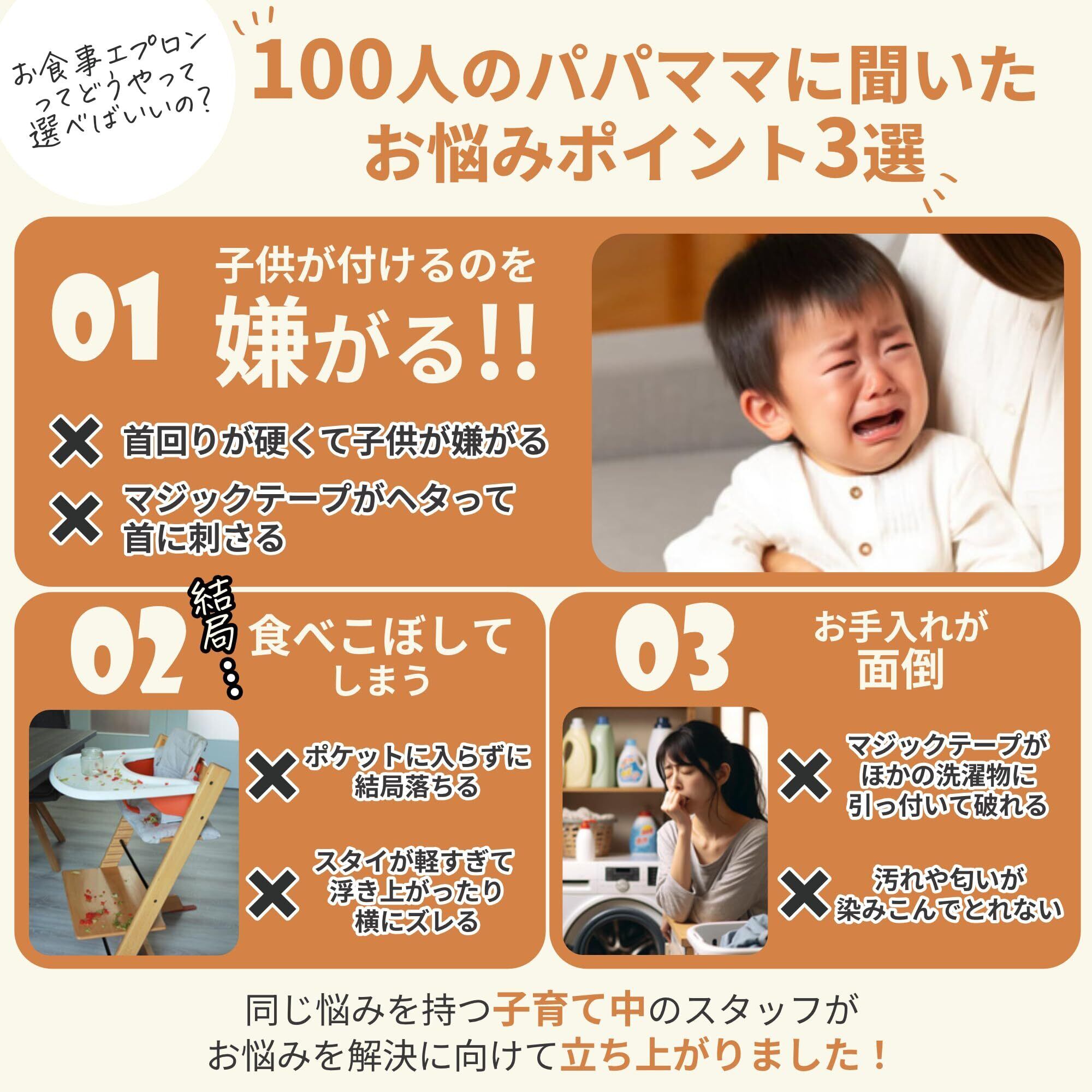 実際に子育て中のスタッフが、我が子に着せたいと思えるエプロンを開発しました。 「ビニール素材やマジックテープだと素材が硬くてお子さんが嫌がる」 そんなパパママは是非お試しください!