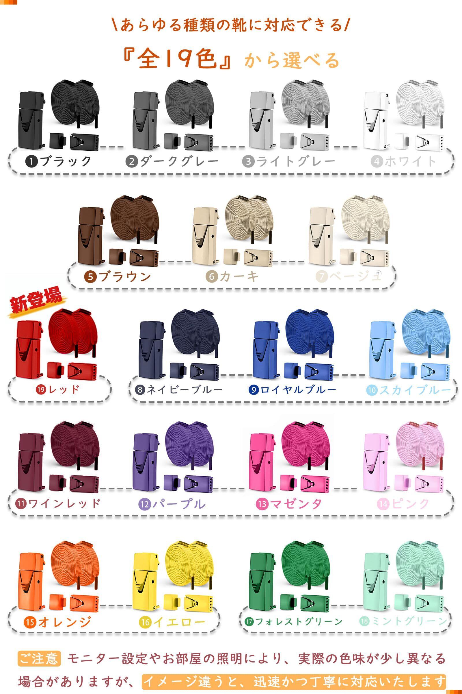 【全18色から選べる】スニーカー、ブーツ、ドレスシューズなど、あらゆる種類の靴に対応できる18色を用意しています。バックルと靴ひもが同色で、カラフルなひもを靴のアクセントカラーとして使うこともでき、オリジナルのコーディネートを楽しめます