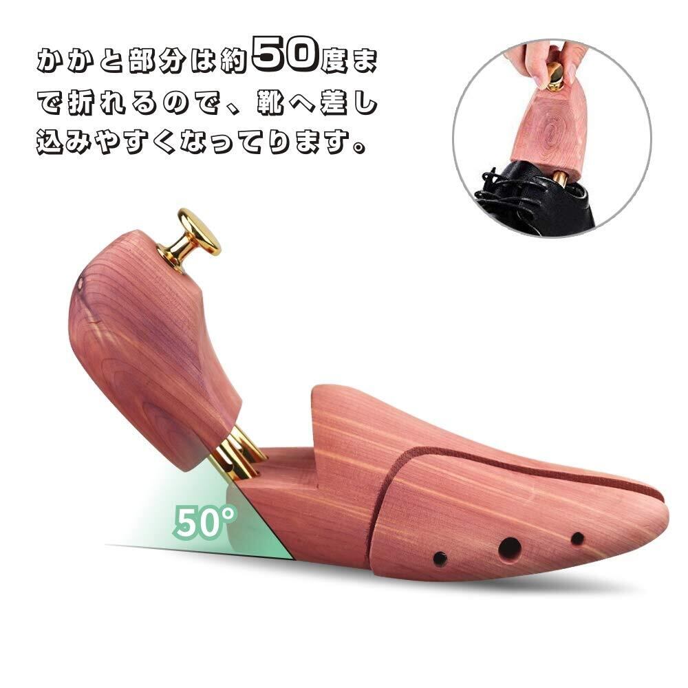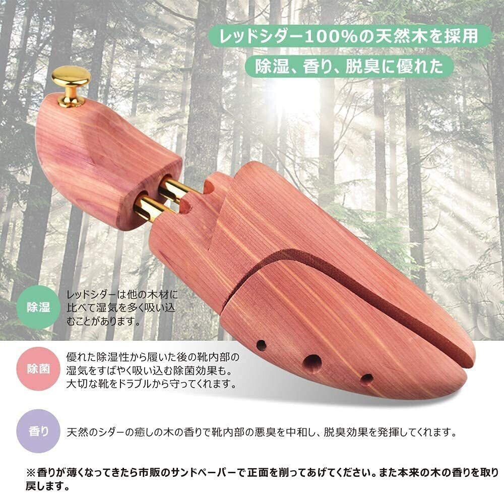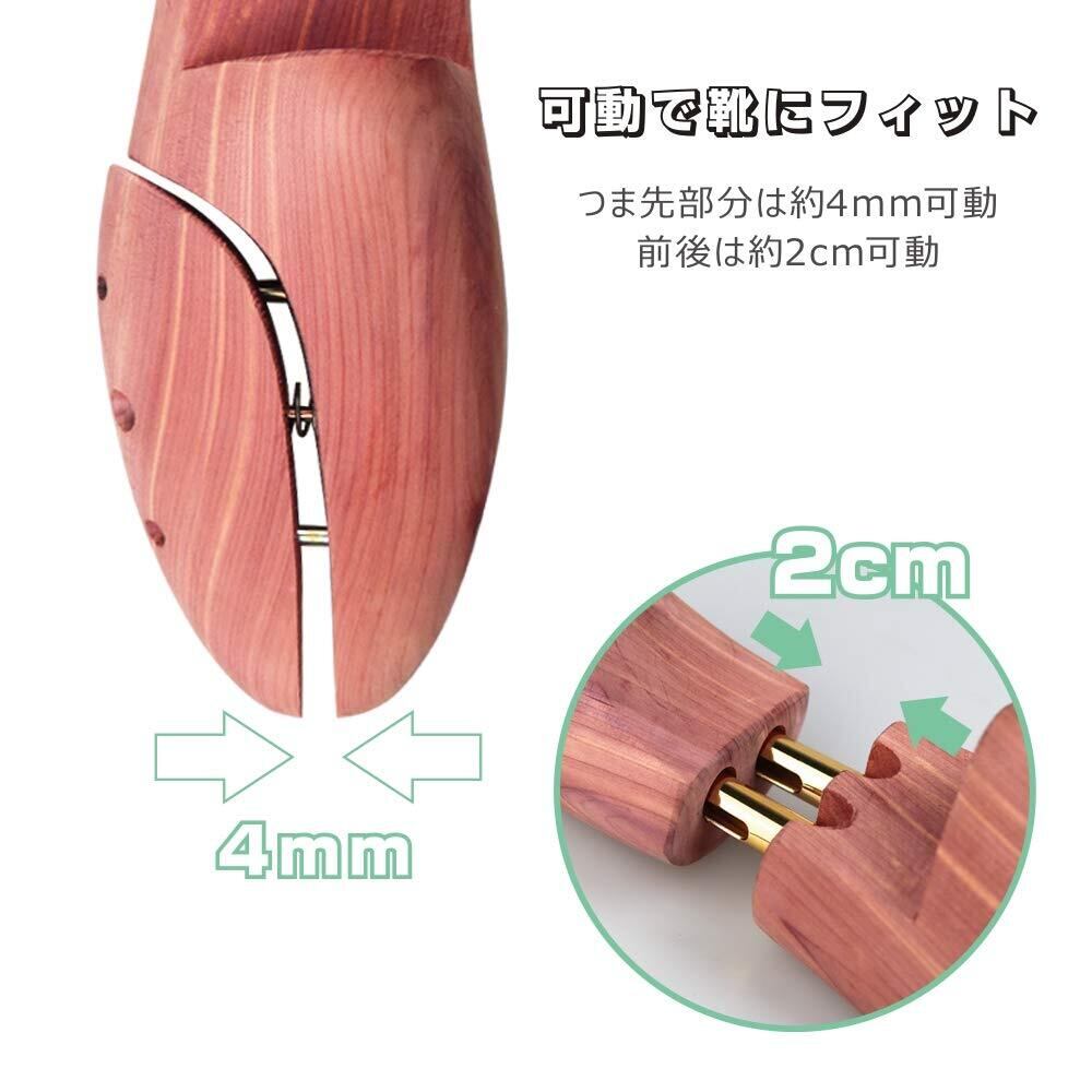 【レッドシダー素材】シューキーパーはレッドシダー100%の天然木を使用しており、そのシダーの効果を十二分に発揮させる無塗装仕上げです。天然の成分により、防臭・防虫・芳香・吸湿効果の高い、また、天然レッドシダーは変形、変質しにくく耐久性に優れた素材ですので、長期にわたり使用できます。ご承知:天然の素材(木)を使用しているため、色のバラツキがあります。商品の色や質感を出来るだけ忠実に再現するよう心がけていますが実物と若干異なる場合がございます。