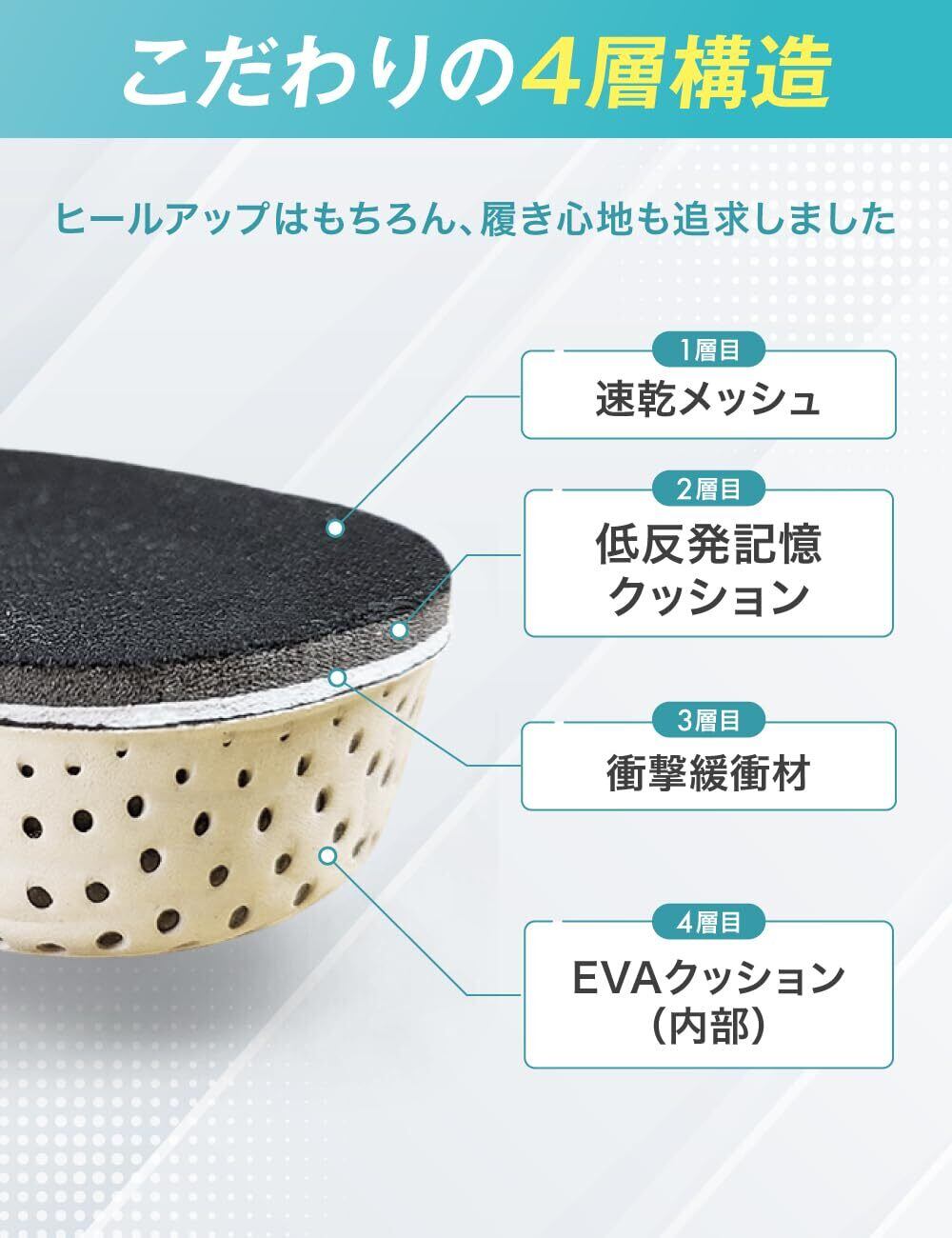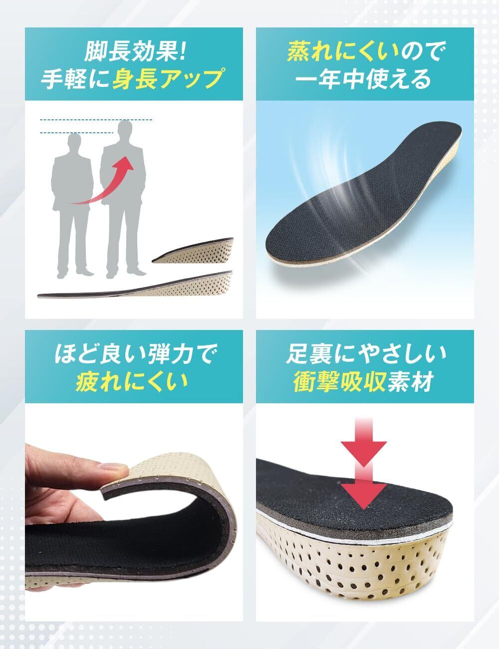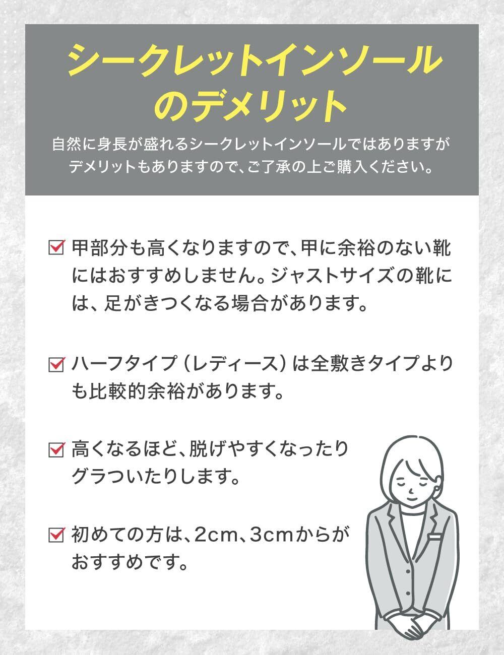 長さサイズ:22.5cm~27.0cm(※ハーフタイプは、レディース専用) 全敷タイプ 重さ(3cm):片方約30g 軽量で 靴に入れるだけで一気に身長アップでき、姿勢も良くなります。
