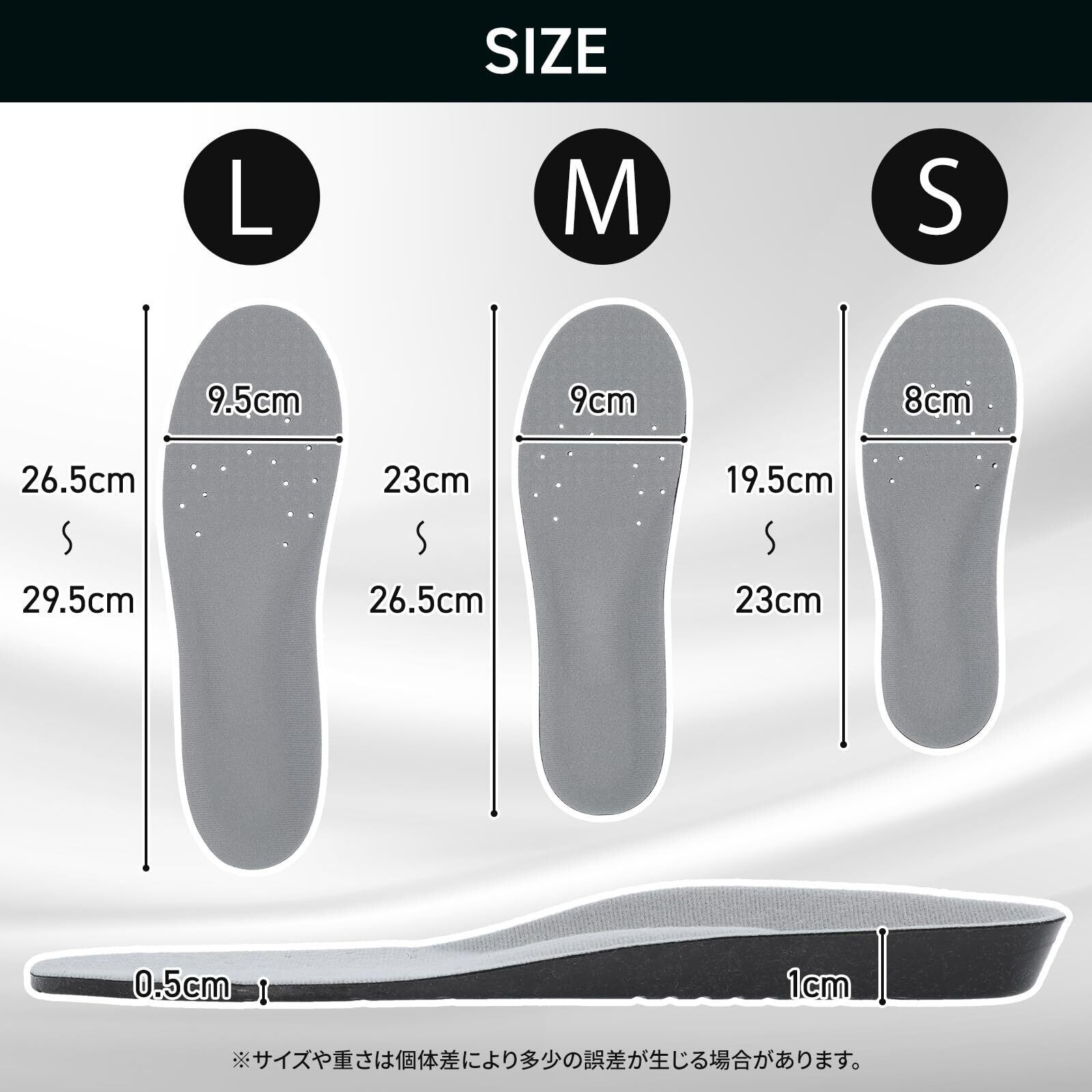 【サイズ】S:19.5~23cm、M:25.5~28cmと23~26.5cm、L:26.5cm~29.5cm(※つま先部で約0.5cm、かかと中心部で約1cmの厚みがあります。ジャストサイズの靴、紐で調節のできない靴でのご使用は、窮屈になる場合がありますのでご注意ください) 男性用インソール 、 メンズインソール :M、L 女性用インソール 、 レディースインソール :S