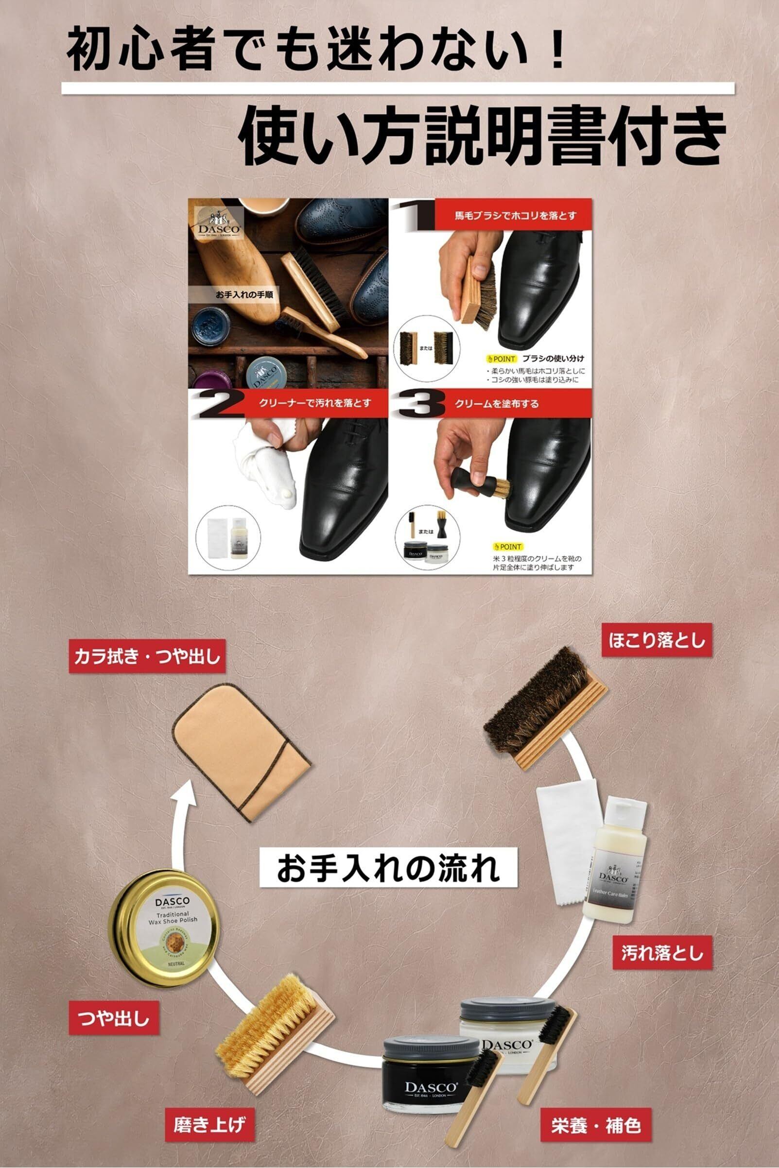 【初心者でも安心。みがき方ガイド】写真入りでわかりやすいガイドで、初心者でも迷わず使用できます。プロのような鏡面仕上げができるポリッシュまで入って、靴磨き上級者も満足。