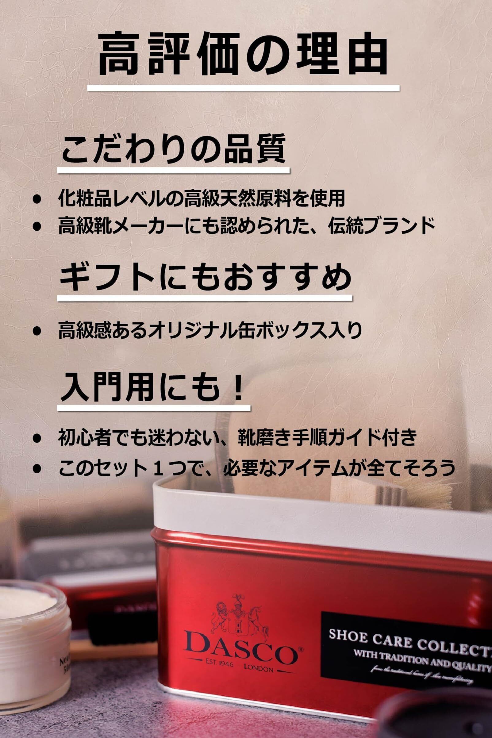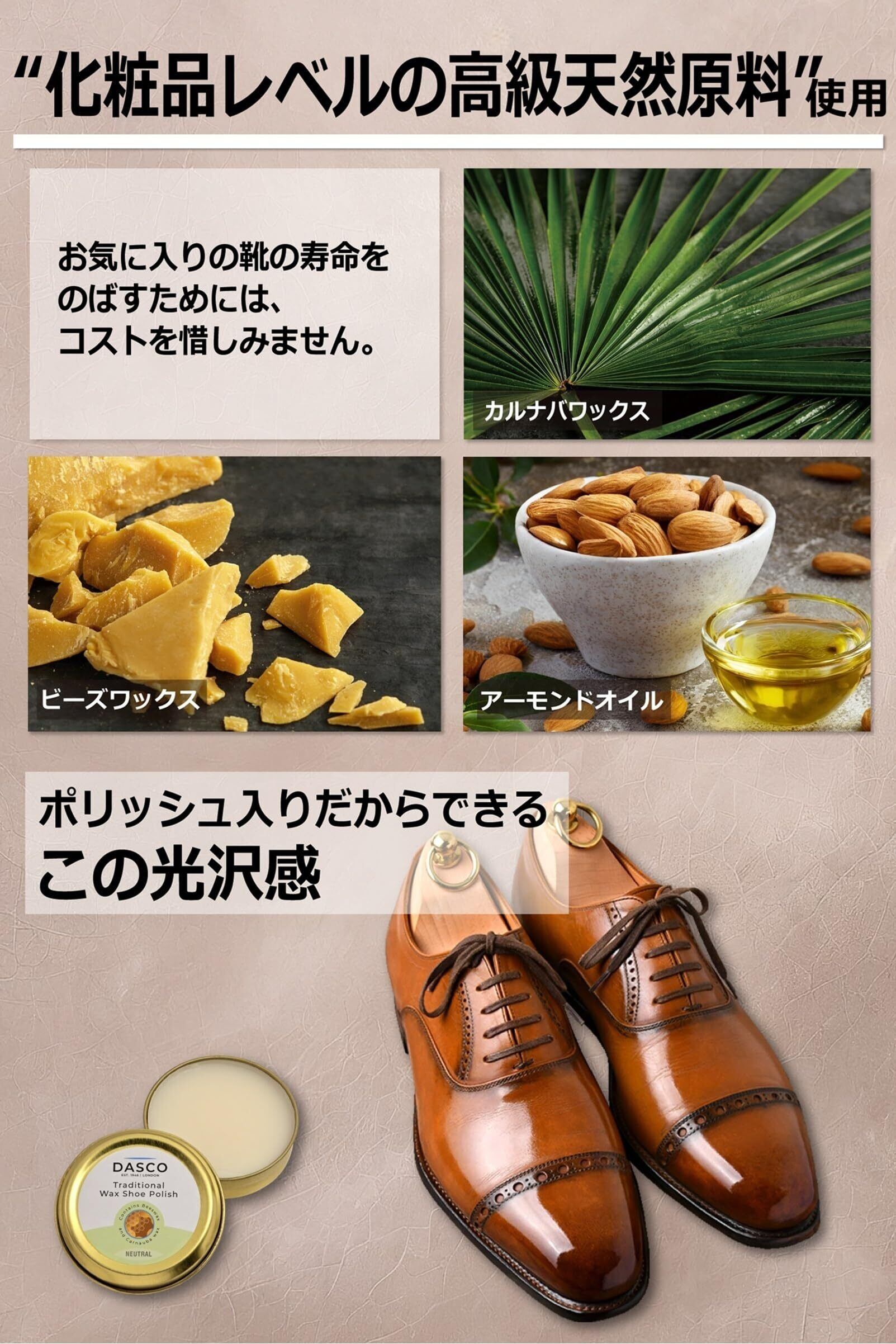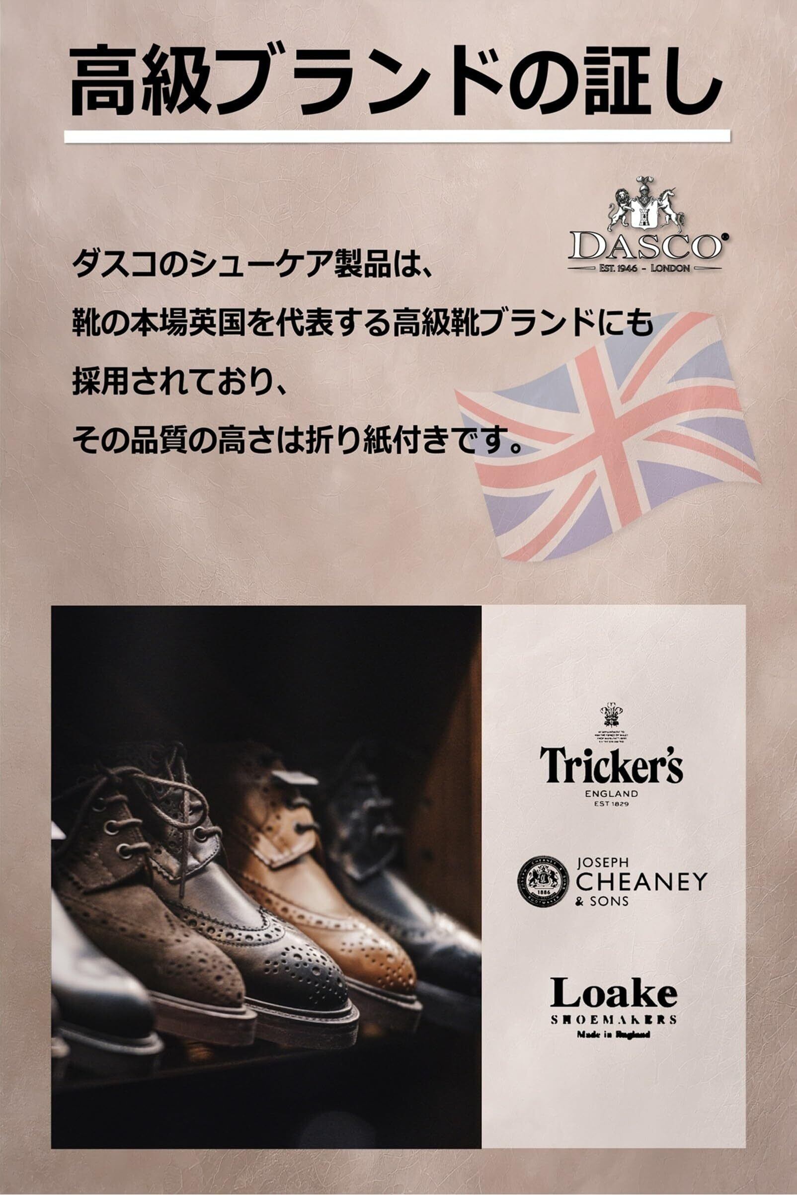 【高級靴ブランドでも採用】ダスコの靴クリームは、厳選された天然原料をおしみなく配合。伝統的な製法とレシピで作られています。そのクオリティーと仕上がりの美しさは、数多の最高級靴ブランドに採用されています。