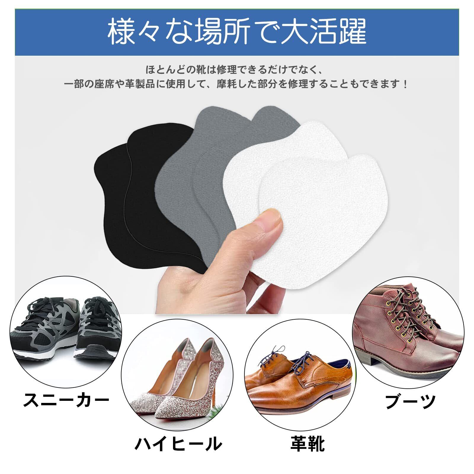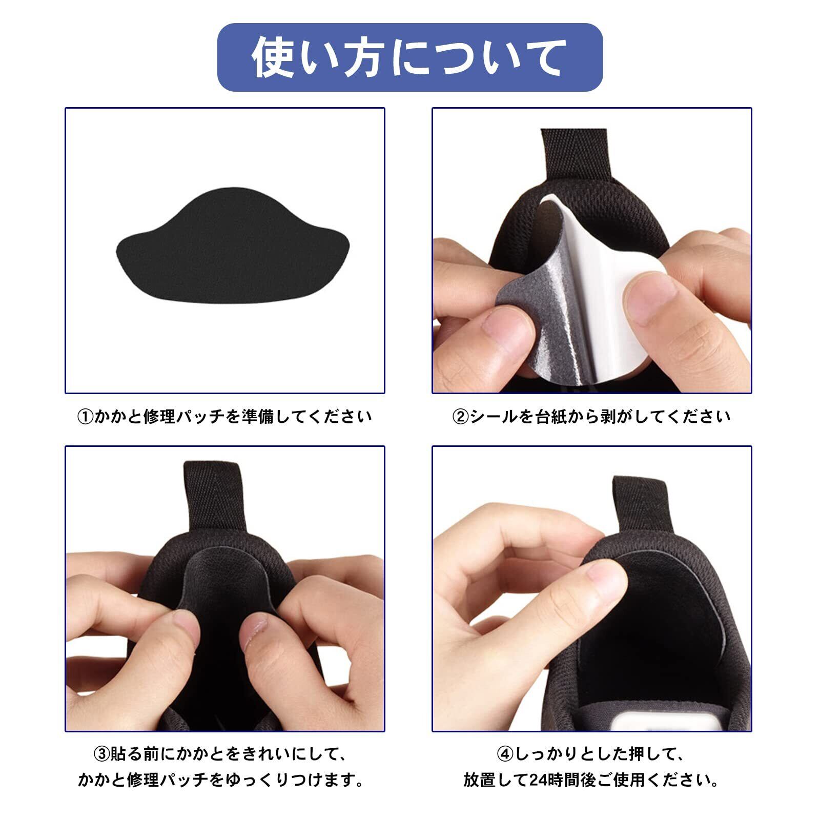 【粘着性が強い&自由にカット可能】 裏面のステッカーをはがして穴に直接貼り付けるだけです。この修理パッチは防水性があり、粘着性が強く、かかと部分に貼ると、滑り落ちる心配がありません。損傷した場所に貼り付けて平らに押します。すり切れた部分をしっかりガードします。また、ノンマーキング接着剤を採用しているので、靴を傷つけません。 &この修復パッチは厚さ約1mmと薄型なので、さまざまなサイズや形にカットしたりすることができ、靴に合わせて自由にカット調整できます。貼る前に一度かかとに当ててサイズを見て、大きい場合はハサミで適切にカットしてください。