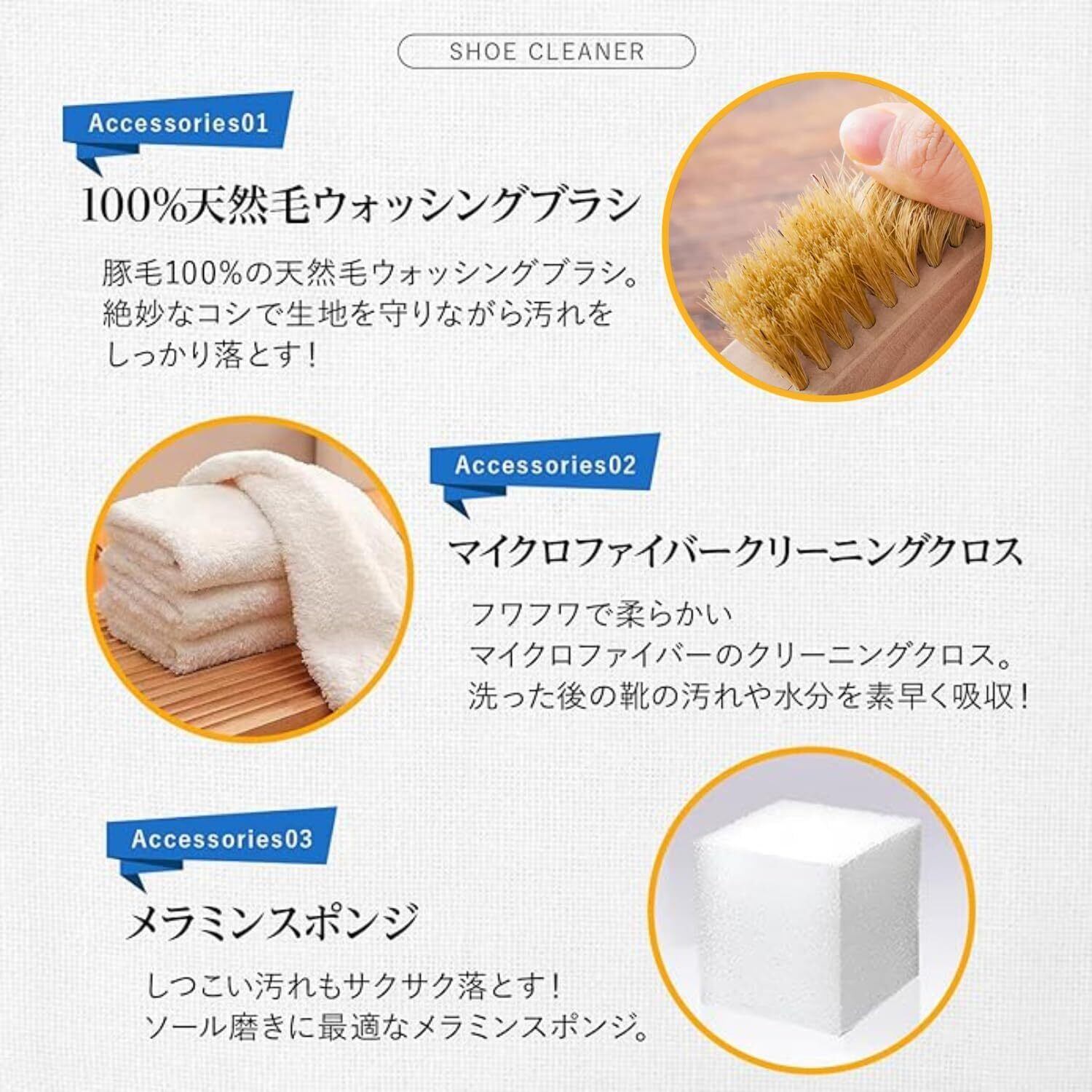 【セット内容】スニーカークリーニング用シャンプー(200ml)、ブラシ、マイクロファイバークリーニングクロス、メラミンスポンジ