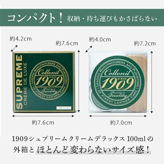 【1909シュプリームクリームデラックス】皮革への浸透力の高いシーダーウッドオイル、ラノリンなどの天然オイルを配合した皮革のための最高級栄養クリームです。バランス良く保革・栄養効果、柔軟性を与え、補色性にも優れています。皮革内部へゆきわたることで微細な皮革繊維に潤いを与え、深みのあるしっとりとしたツヤが生まれます。