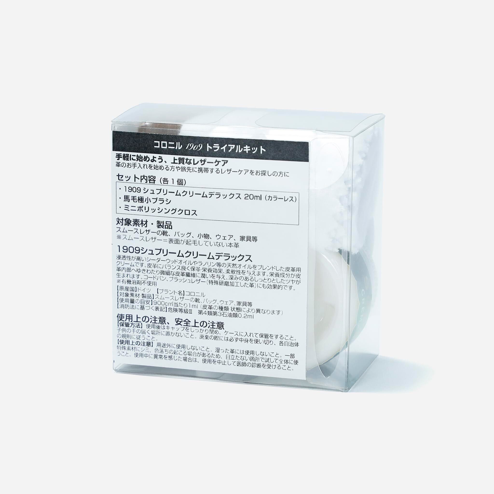 【手軽に始めよう、上質なレザーケア】コロニルを代表する1909シュプリームクリームデラックスのミニサイズをはじめ、初めての方でも簡単に靴やバッグなど革のお手入れができる、厳選したアイテムを揃えたトライアルキットをご用意いたしました。内容:◆1909シュプリームクリームデラックス◆馬毛極小ブラシ◆ポリッシングクロス