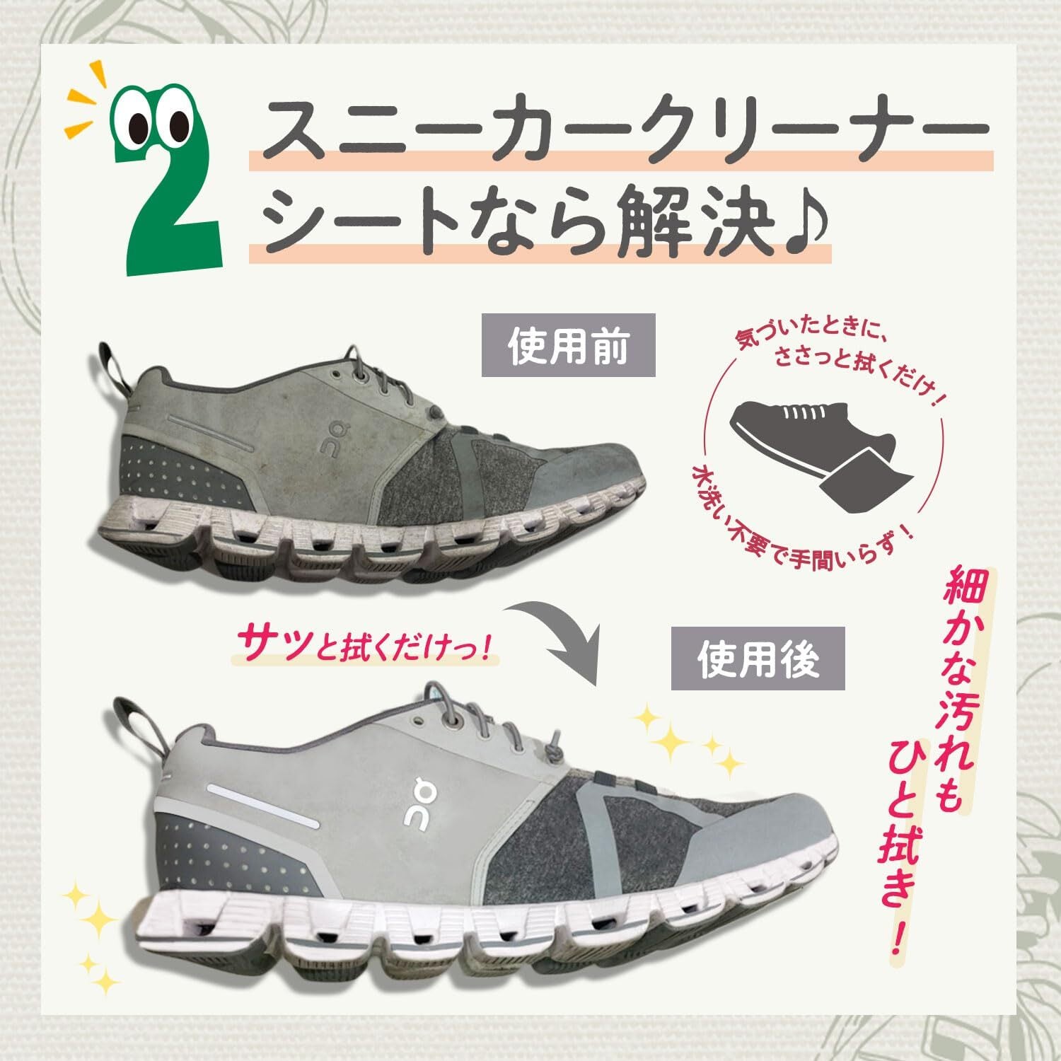 ■使用方法:1.表面のシールを端からはがし、1枚ずつ取り出してください。 2.シートで汚れをこすり、乾いた布で乾拭きしてください。 ※色落ちや傷、質感の変化、黄ばみなどの心配がある方は、必ず目立たないところで試し拭きをしてから使用してください。※靴を傷める可能性がありますので、強くこすりすぎないでください。また、砂利などの大きな汚れはあらかじめブラシや布で落としてから使用してください。