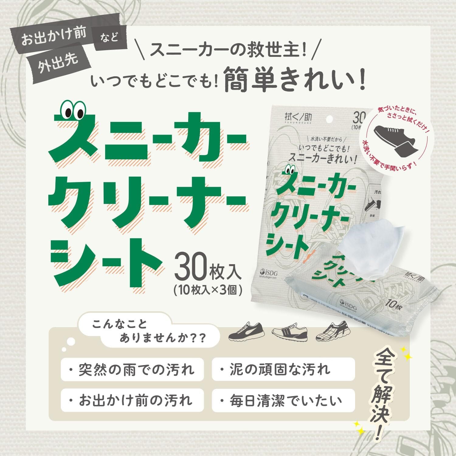 拭くノ助 スニーカークリーナーシート 10枚×3個(30枚入り)